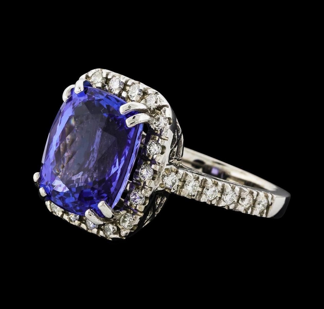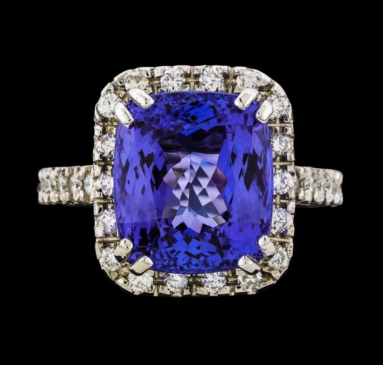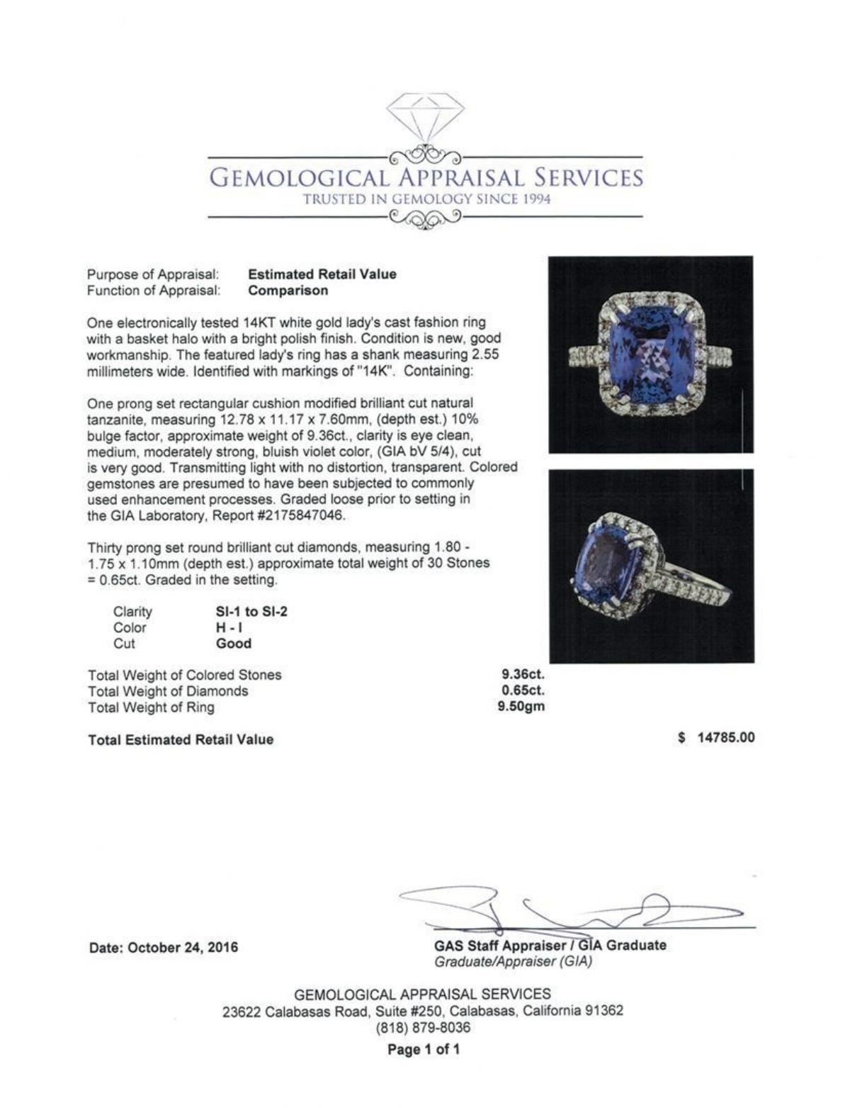 One electronically tested 14KT white gold lady's cast fashion ring with a basket halo with a bright polish finish. The featured lady's ring has a shank measuring 2.55 millimeters wide. Identified with markings of '14K'. Condition is new, good workmanship. Containing: One prong set rectangular cushion modified brilliant cut natural tanzanite, measuring 12.78 x 11.17 x 7.60mm, (depth est.) 10%. bulge factor, approximate weight of 9.36ct., clarity is eye clean, medium, moderately strong, bluish violet color, (GIA bV 5/4), cut is very good. Transmitting light with no distortion, transparent. Colored gemstones are presumed to have been subjected to commonly used enhancement processes. Graded loose prior to setting in the GIA Laboratory, Report #2175847046. Thirty prong set round brilliant cut diamonds, measuring 1.80 - 1.75 x 1.10mm (depth est.) approximate total weight of 30 Stones = 0.65ct. Graded in the setting. Clarity SI-1 to SI-2. Color: H - I Cut Good. Total Weight of Colored Stones 9.36ct.. Total Weight of Diamonds 0.65ct.. Total Weight of Ring 9.50gm. GAS Appraised.