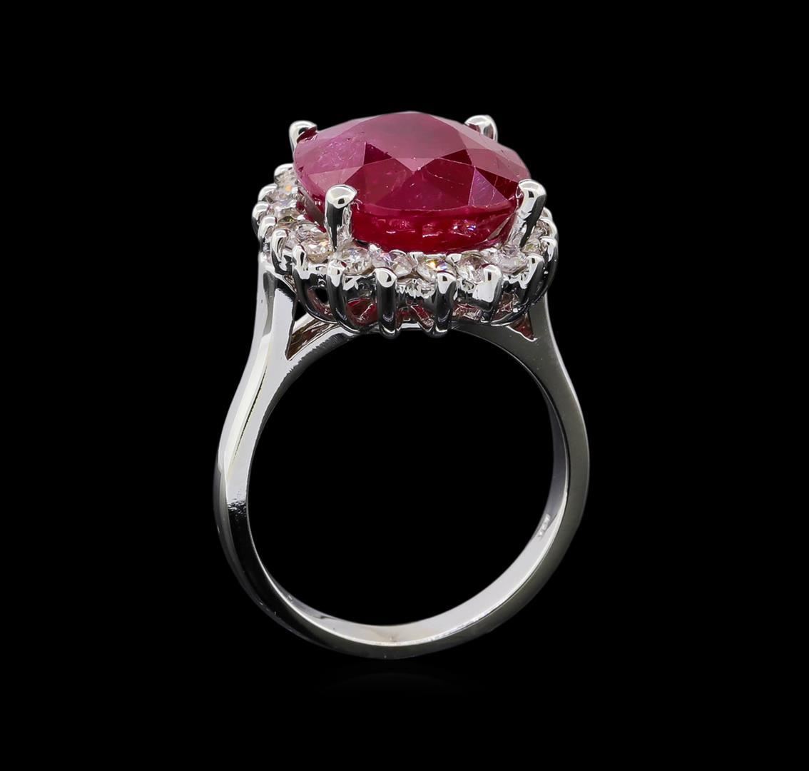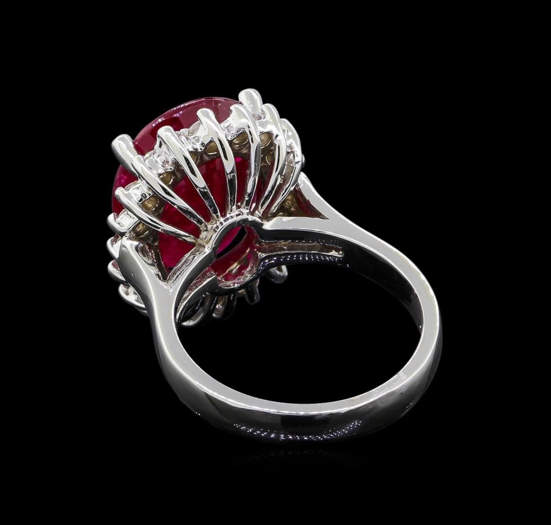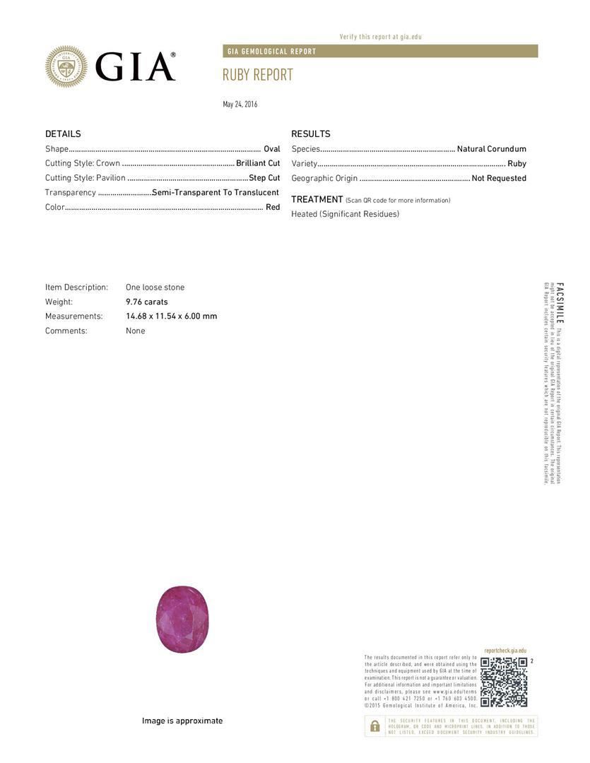 One electronically tested 14KT white gold lady's cast fashion ring with a basket halo with a bright polish finish. The featured lady's ring has a shank measuring 3.11 millimeters wide. Identified with markings of '14K'. Condition is new, good workmanship. Containing: One prong set oval modified mixed cut natural ruby, measuring 14.68 x 11.54 x 6.00mm, (depth est.) 10%. bulge factor, approximate weight of 9.76ct., clarity is severely included, medium dark, very slightly brownish, red color, (GIA R 6/3), cut is very good. Transmitting light somewhat diffusely, semi-transparent to translucent. Naturally occurring internal & external characteristics are present. Colored gemstones are presumed to have been subjected to commonly used enhancement processes. Graded loose prior to setting in the GIA Laboratory, Report #5171603392. Twenty prong set round brilliant cut diamonds, measuring 2.10 - 2.00 x 1.27mm (depth est.) approximate total weight of 20 Stones = 0.66ct. Graded in the setting. Clarity SI-1 to SI-2. Color: G - H Cut Good. Total Weight of Colored Stones 9.76ct.. Total Weight of Diamonds 0.66ct.. Total Weight of Ring 8.40gm. GAS Appraised.
