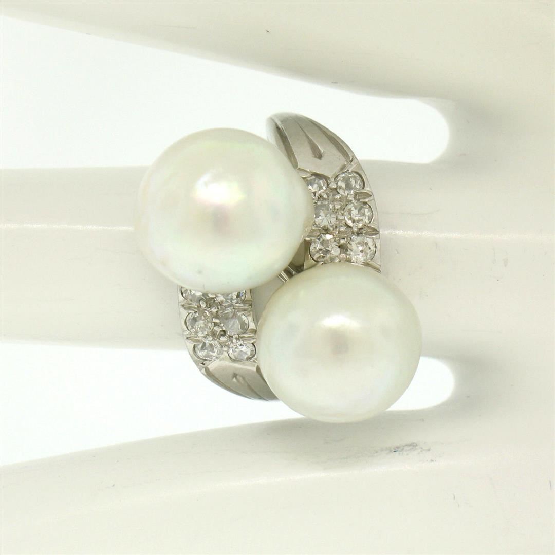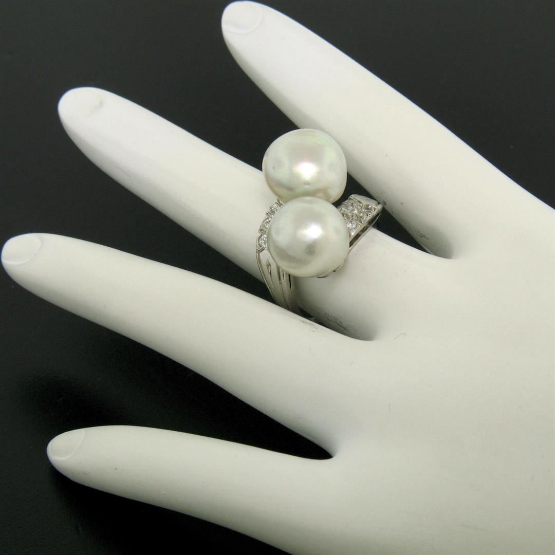One GIA Certified Antique Solid Platinum Large Pearl & Diamond Bypass Cocktail Ring. Item Details: Material: .900 Solid Platinum, Weight: 11.50 Grams, Stone(s): (2) Natural Genuine Cultured Pearls - ** See Certification Details Below for Complete Info **, (11) Natural Genuine Diamonds - Round Single Cut - Pave Set - G-H Color - VS2-SI1 Clarity 0.30ctw (approx.), Total Carat Weight: 0.30ctw (approx.), Ring Size: 6.5, Ring Width: 21mm at its widest (where the pearls are), Ring Height: 11.75mm rise off the finger at its very highest, Condition: Original finish preserved. Pearls are Perfect and diamonds are secure. Certification Details Laboratory: GIA, Report Number: 1176402030, Stone Type: Cultured Saltwater Pearls from the Pinctada Maxima Mollusk. Stone Shape: Semi-Baroque. Dimensions: A-11.18x10.88mm and B-12.24x11.12mm, Color: White with Orient Overtone