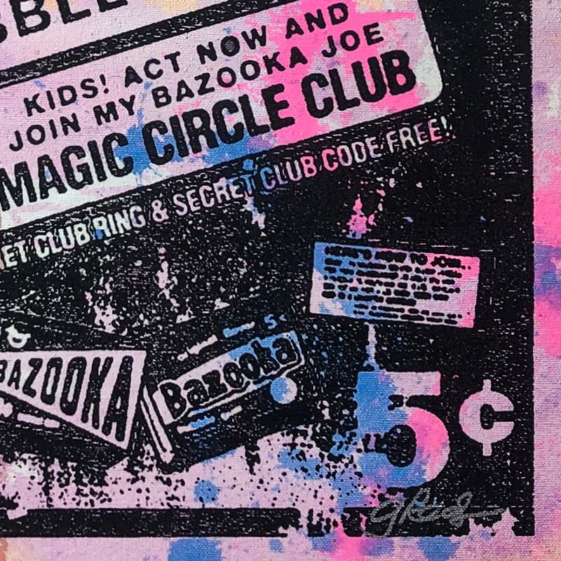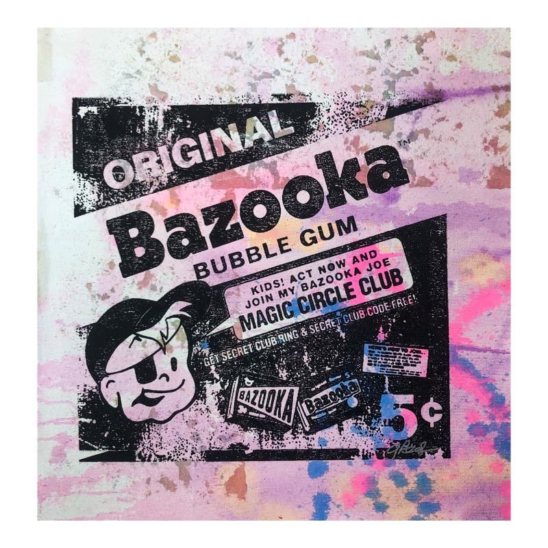 "Bazooka Joe" is an original hand pulled silkscreen and acrylic painting on canvas by Gail Rodgers. Hand signed by the artist, the piece comes with a letter of authenticity. This piece is meant to be gallery wrapped and measure approximately 23" x 23" and image dimensions (after stretching) 16" x 16" (image).