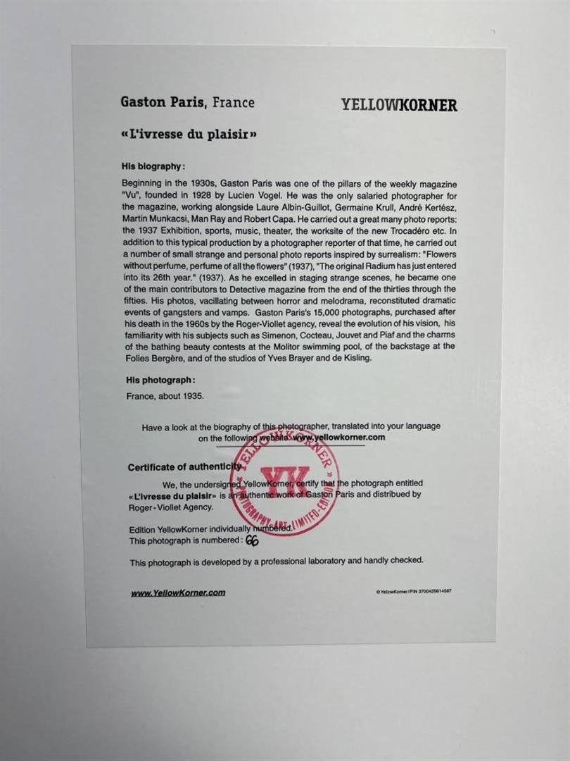 Gaston Paris France Livresse Du Plaisir YellowKorner Certified Photograph. Certificate of Authenticity from YellowKorner affixed to the back. Matted Dimensions 16"x20". Protected with Clear Mylar Sleeve.