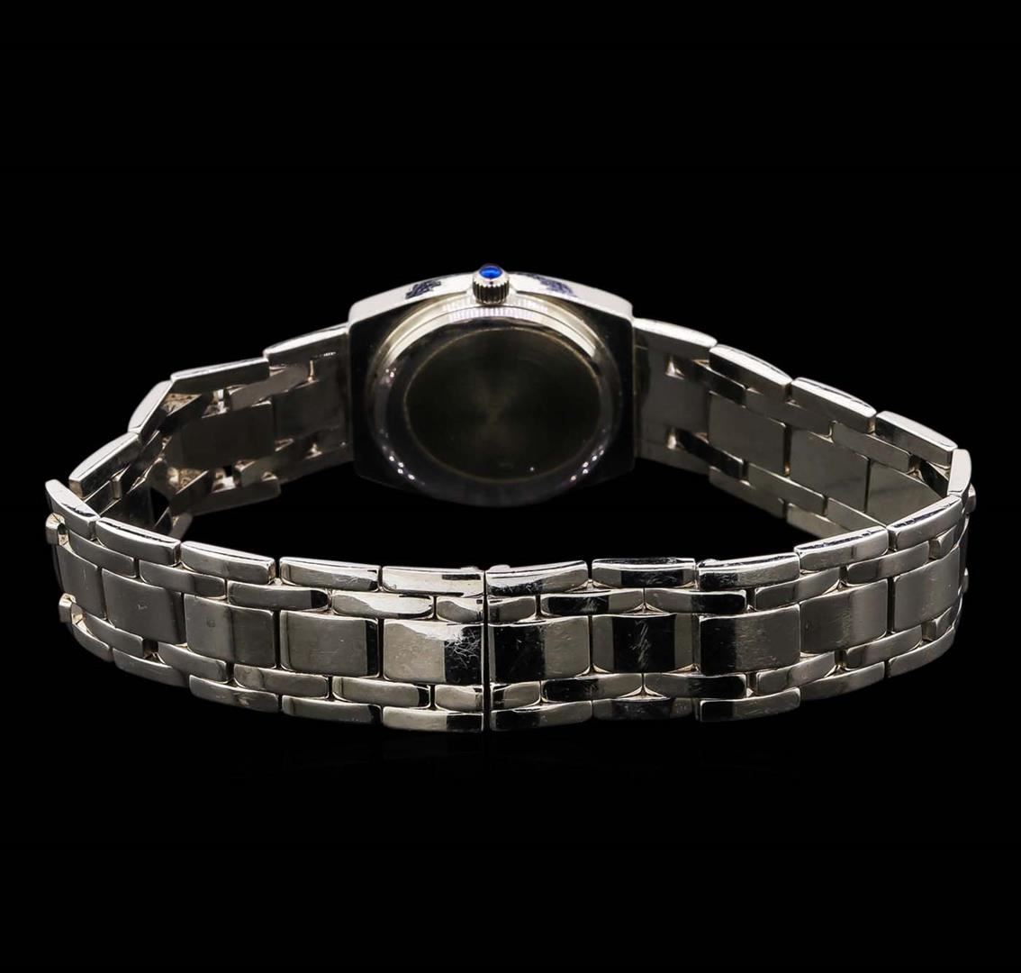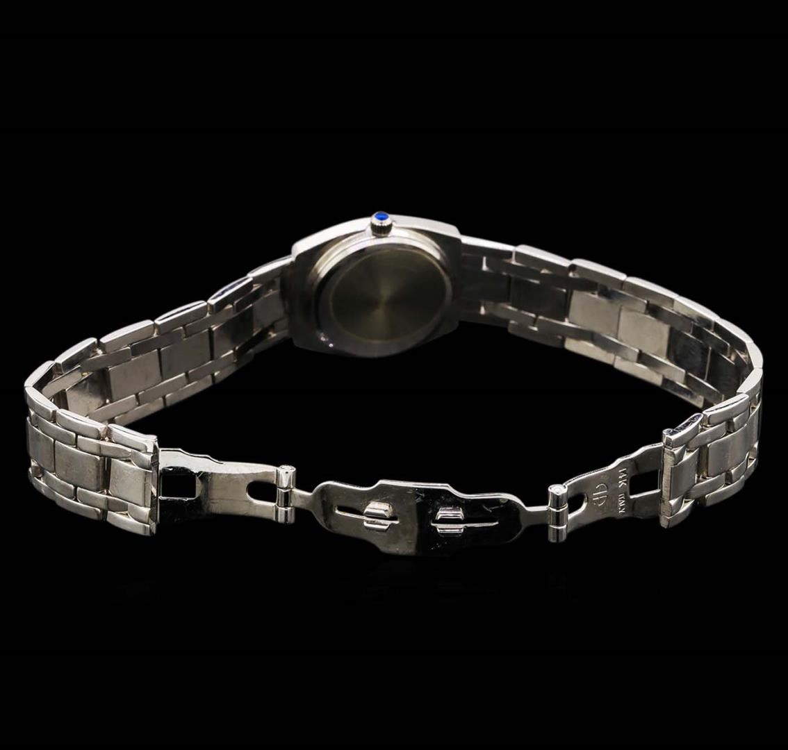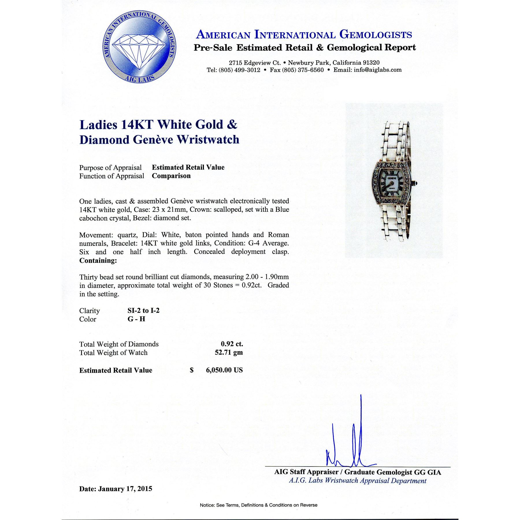 One ladies, cast & assembled Genève wristwatch electronically tested 14KT white gold, Case: 23 x 21mm, Crown: scalloped, set with a Blue cabochon crystal, Bezel: diamond set. Movement: quartz, Dial: White, baton pointed hands and Roman numerals, Bracelet: 14KT white gold links, Condition: G-4 Average. Six and one half inch length. Concealed deployment clasp. Containing: Thirty bead set round brilliant cut diamonds, measuring 2.00 - 1.90mm in diameter, approximate. Total Weight of 30 Stones = 0.92ct. Graded in the setting. Clarity: SI-2 to I-2. Color: G - H. Total Weight of Diamonds 0.92ct. Total Weight of Watch 52.71 grams. AIG Appraised.