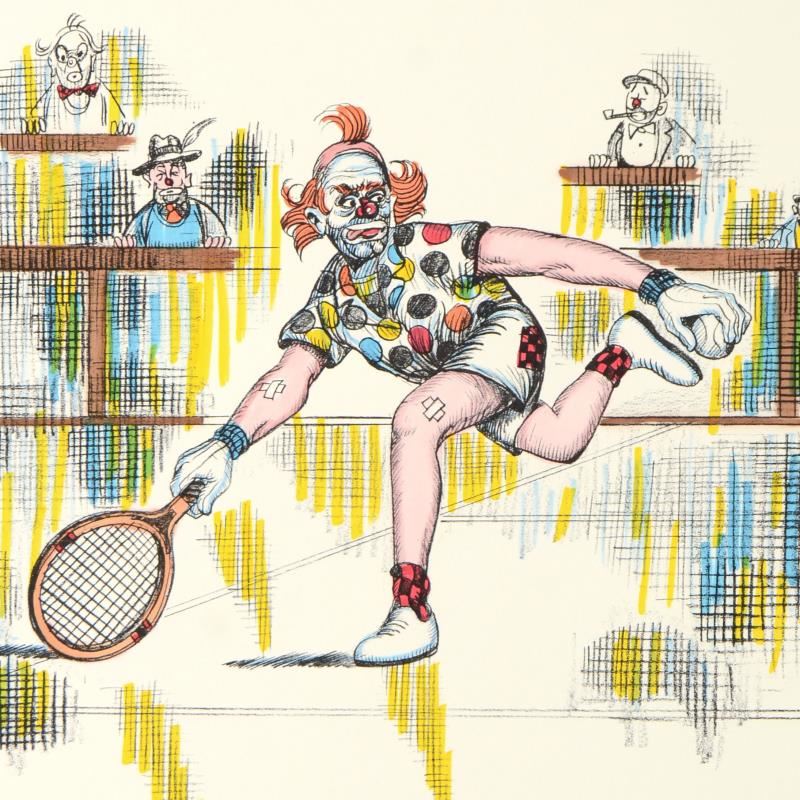 "Tennis Bum" is a hand embellished limited edition lithograph on paper by George Crionas (1925-2004), numbered and hand signed by the artist. Includes Letter of Authenticity. Measures approx. 20" x 26" (border), 18" x 24" (image). ** Please note: there is minor creases and wear on the corners and edges that may be concealed when framed. **