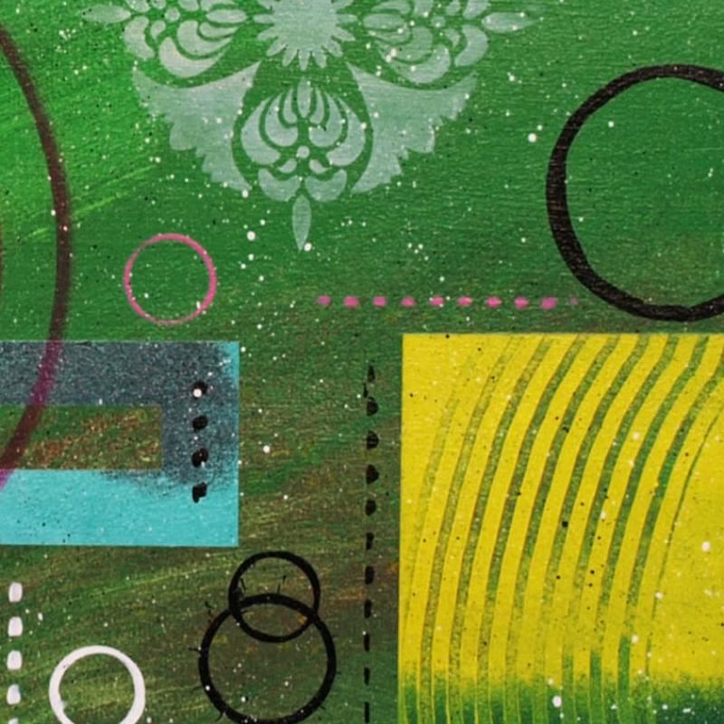 "Emerald Galaxy" is an original acrylic painting on canvas by George Marlowe, hand signed by the artist. This piece comes gallery wrapped. Includes Letter of Authenticity. Measures approx. 36" x 36" (image).