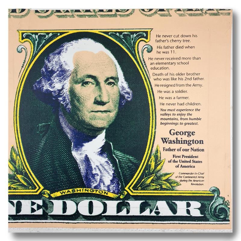 "George Washington, Father of Our Nation " is a limited edition hand pulled silkscreen mixed media on canvas by Andy Warhol protege Steve Kaufman (1960-2010). This piece is numbered and AP 3/50 and hand signed inverso. Includes letter of authenticity. As is common with Kaufman's works, this piece may have perceived minor flaws, but is in overall good condition. Measures approximately 26" x 26" (image).