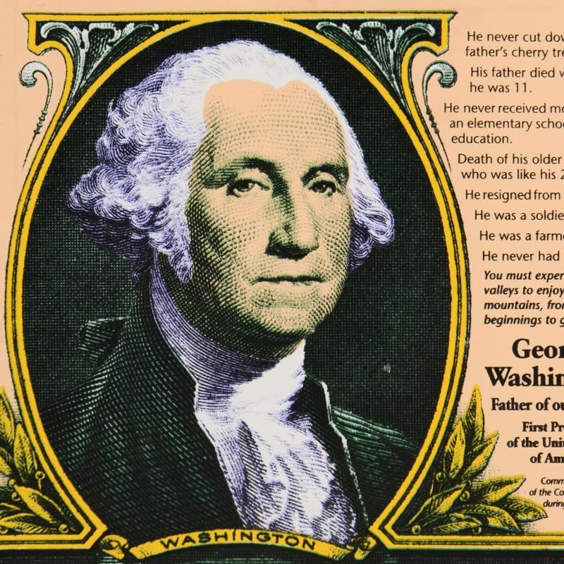 "George Washington" is a limited edition silkscreen on canvas by Andy Warhol protege Steve Kaufman (1960-2010). This piece is numbered 99/200 and hand signed inverso. Includes Certificate of Authenticty. Measures approx. 20" x 20" (image). There is minor creasing in the border area (from being previously stretched) that will be concealed when re-stretched.