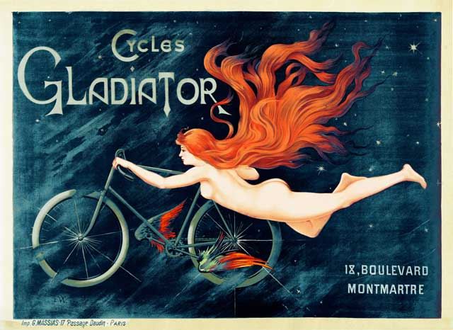 Artist: Georges Massias - Title: Cycles Gladiator - Medium: Fine Art Reproduction Giclee on Canvas - Image Size: Approximately 14.5 inches x 20 inches - Unframed on Unstretched Canvas - Winged pedals take a young lady for a ride in Georges Massias' 1895 poster advertising the Cycles Gladiator bicycle company.