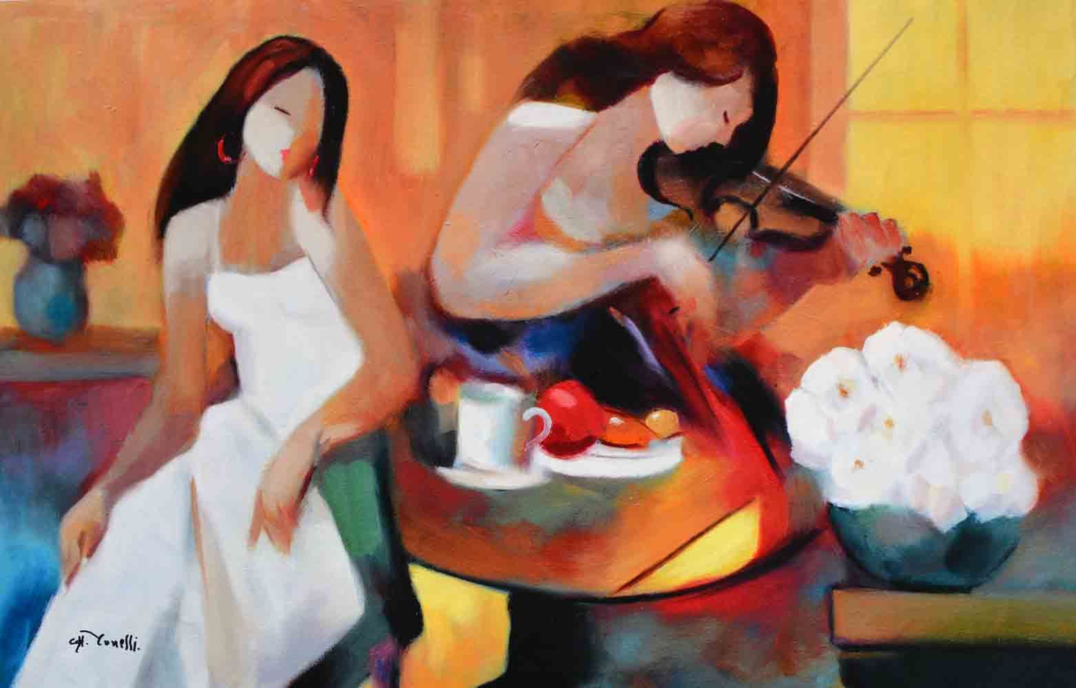 Artist: Gholam Yunessi - Title: Tranquil Melody - Medium: Fine Art Giclee on Canvas - Signature: Hand Signed by the Artist - Image Size: Approximately 24inches x 36 inches - Unframed on Unstretched Canvas - Details: This work comes with a Certificate of Authenticity - Biography: Gholam Yunessi's talent has been molded through years of dedication to the masters of his native Tehran - starting with one of Persia's most famous sculptors, his uncle Esamaeel Yunessi. At the young age of five, Gholam's creative foundations were nurtured and shaped by this familial guide. - In high school, Gholam's talent continued to develop in drawing and charcoal renderings under the guidance of the renowned Persian artist Shaness. Gholam ultimately went on to study the history and technique of fine art painting at the Tehran College of Fine Art. Yunessi finally brought his rich balance of near-eastern and European influences to America, where he has continued to create and produce work that has been recognized and exhibited around the world since 1972.