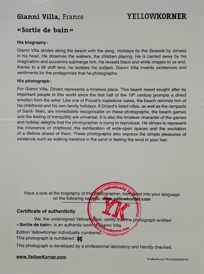 Gianni Villa France Sortie de Bain YellowKorner Certified Photograph. Certificate of Authenticity from YellowKorner affixed to the back. Matted Dimensions 16"x20". Protected with Clear Mylar Sleeve.