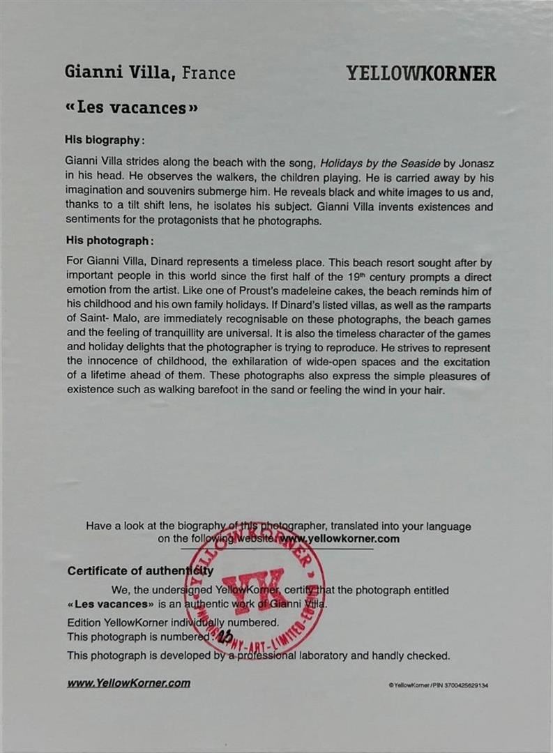 Gianni Villa France Les Vacanes YellowKorner Certified Photograph. Certificate of Authenticity from YellowKorner affixed to the back. Matted Dimensions 16"x20". Protected with Clear Mylar Sleeve.