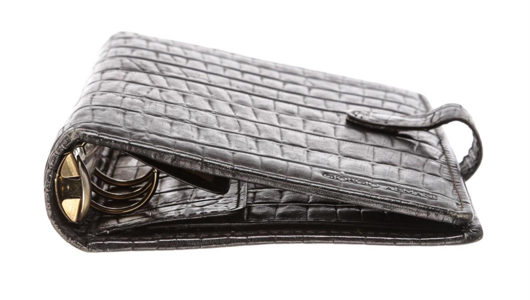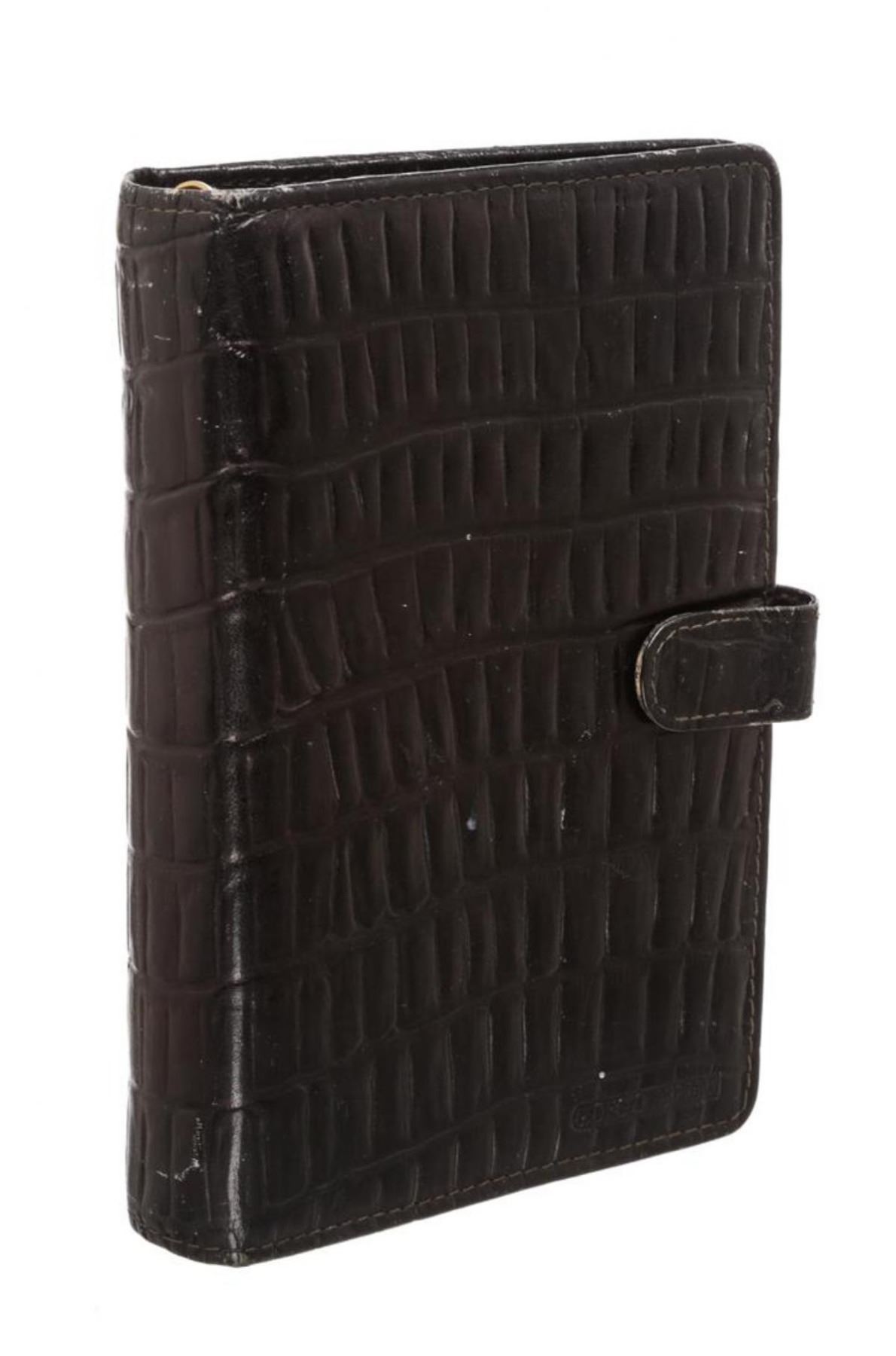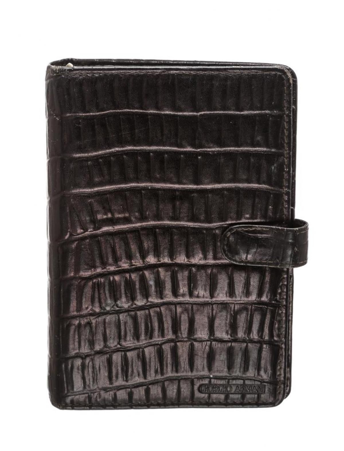 Brown leather Giorgio Armani leather embossed six ring agenda notebook with gold-tone hardware, tonal leather lining, three side slip pockets one business card slip pocket and button snap closure. Agenda paper not included.