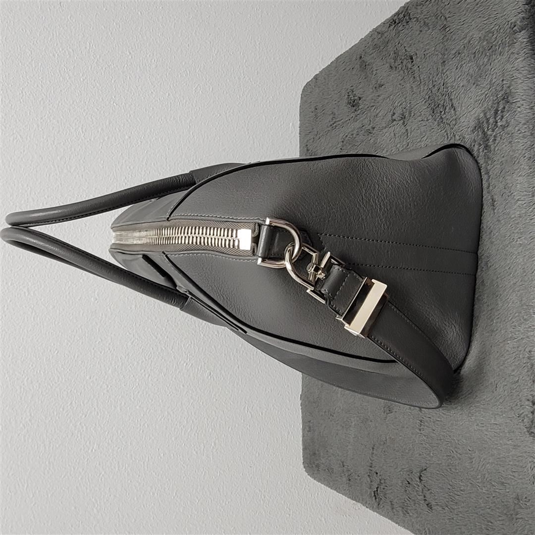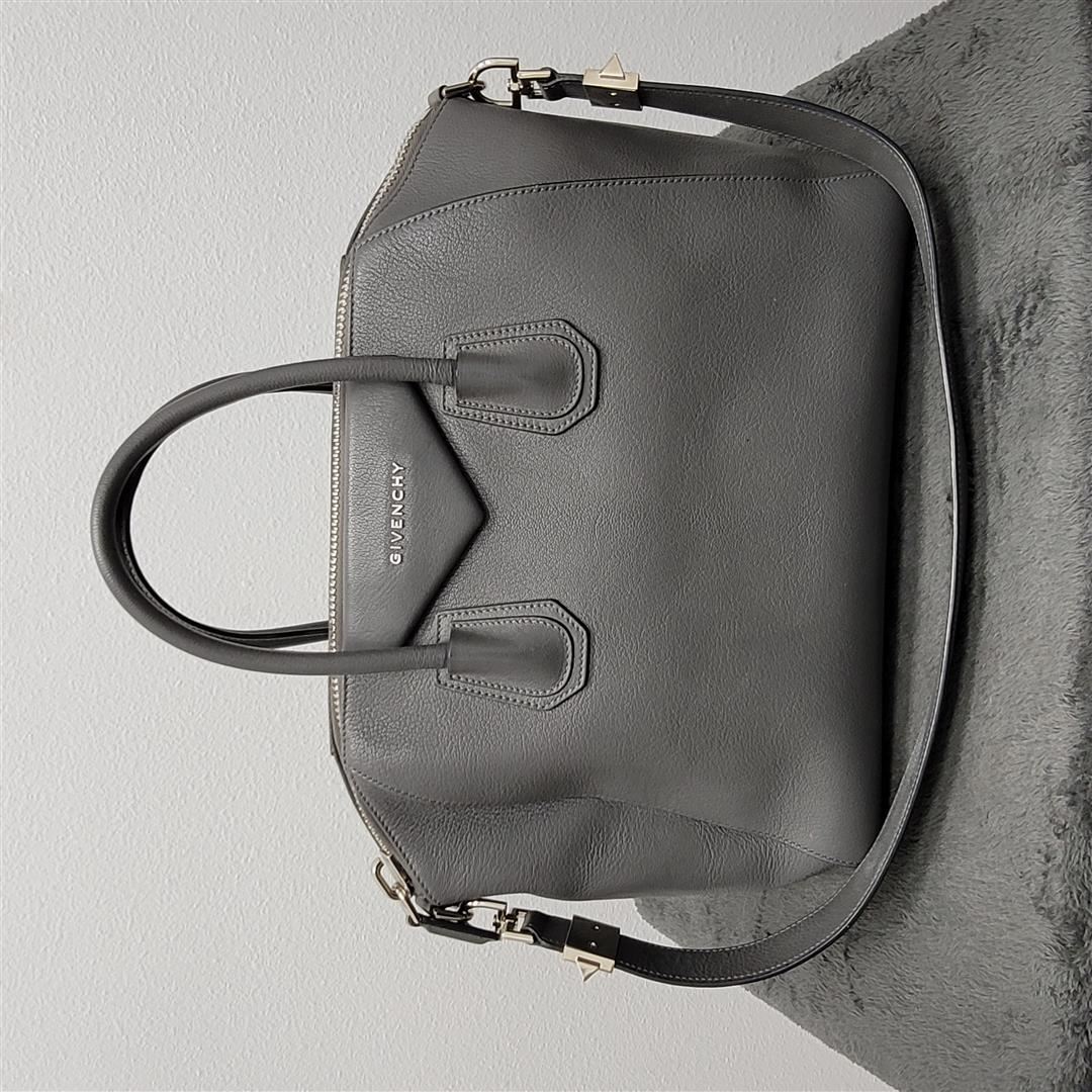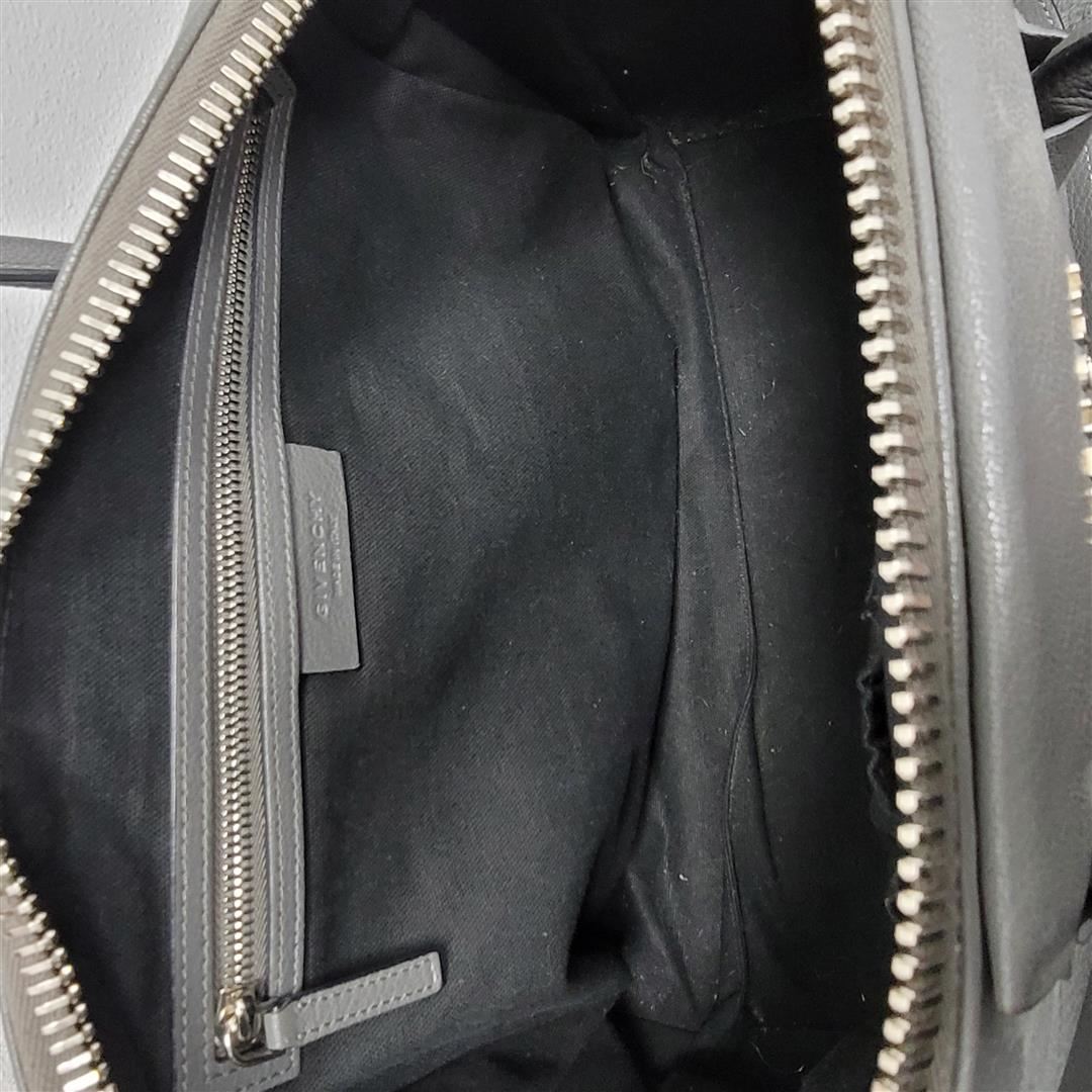 One Givenchy Antigone Medium Leather Satchel. This is an authentic GIVENCHY Sugar Goatskin Medium Antigona in Pearl Grey. This elegant model is crafted of luxuriously grained grey goatskin leather with rolled-leather top handles and a flat leather shoulder strap with silver hardware. The top zipper opens to a black fabric interior with zipper and patch pockets.