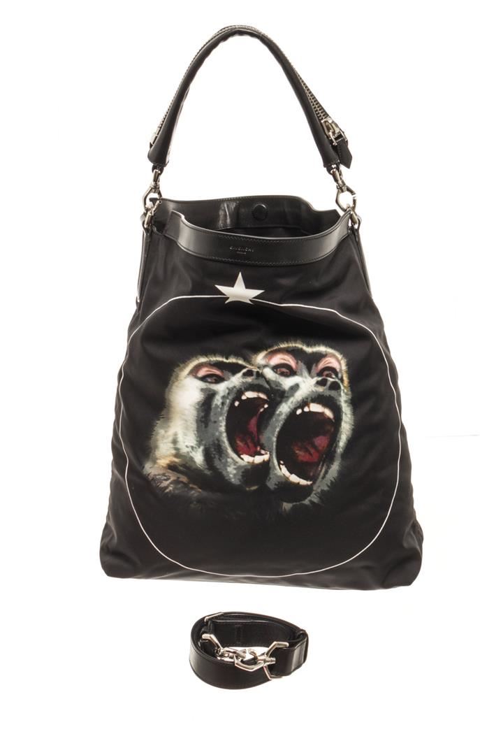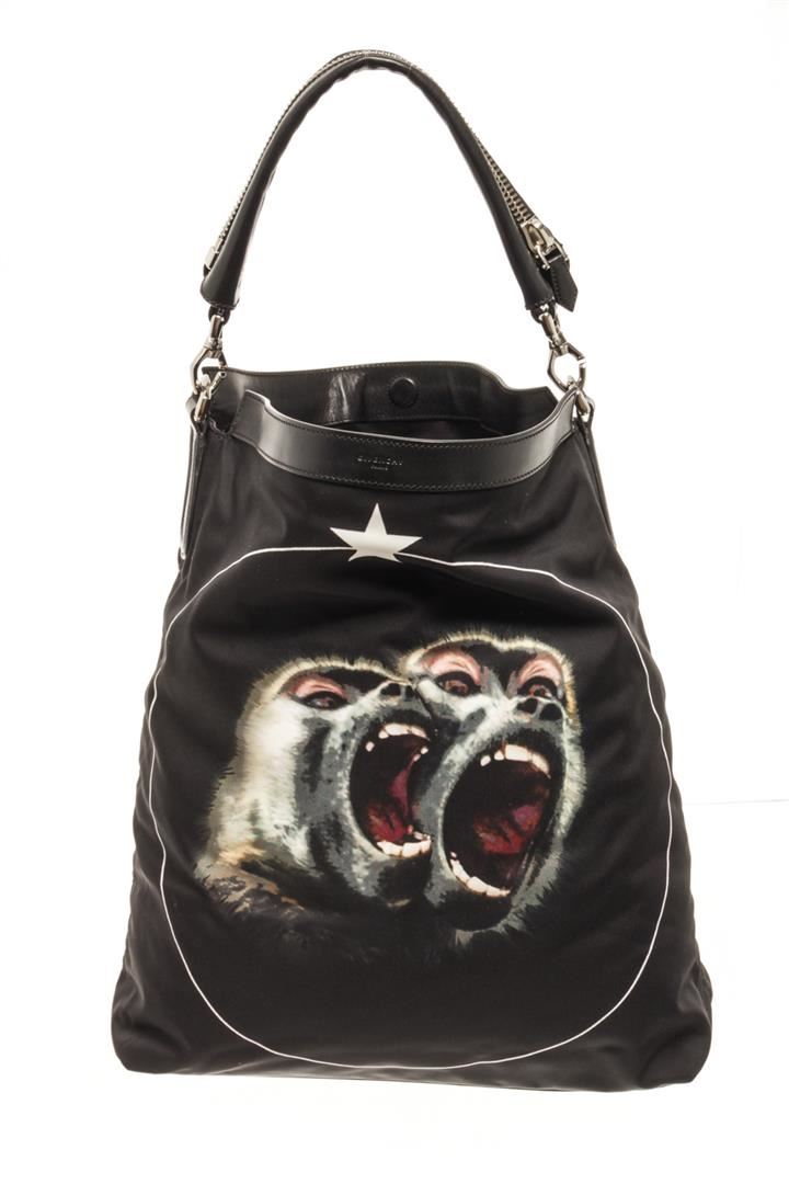 Givenchy Black Nylon Nightingale Monkey Brothers Satchel Bag. All available information is listed in the description and shown in the photos. givenchy black nylon nightingale monkey brothers satchel bag with this satchel features a printed nylon body, a flat leather handle, a detachable flat leather strap, a top zip closure, and interior zip and slip pockets. Height: 18.1" Width: 15" Depth: 5.5, Handle Drop: 7.1" / 45.97 x 38.1 x 13.97 Cm