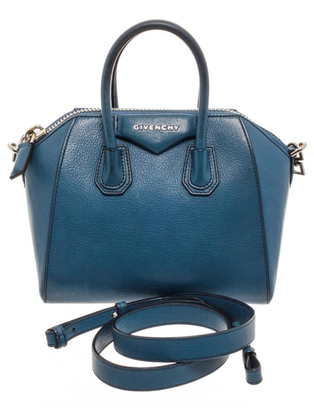 Givenchy blue grained leather Mini Antigona bag with silver-tone hardware, beige canvas lining, two interior slip pockets, interior zip pocket, optional leather shoulder strap, and zip top closure.