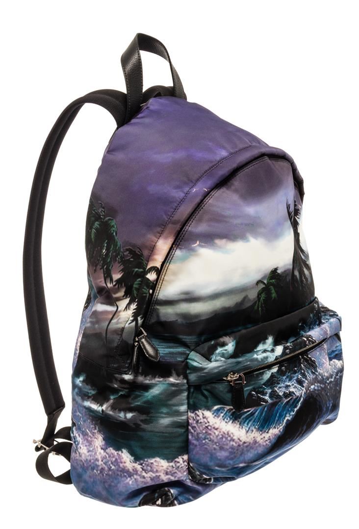 One Givenchy Printed Beach Canvas Pocket Backpack. Item is sold AS-IS. All available information is listed in the description and shown in the photo. Givenchy Printed Beach Canvas Pocket Backpack features black canvas interior, silver toned hardware, two exterior pockets, black leather top handle and two dual straps.