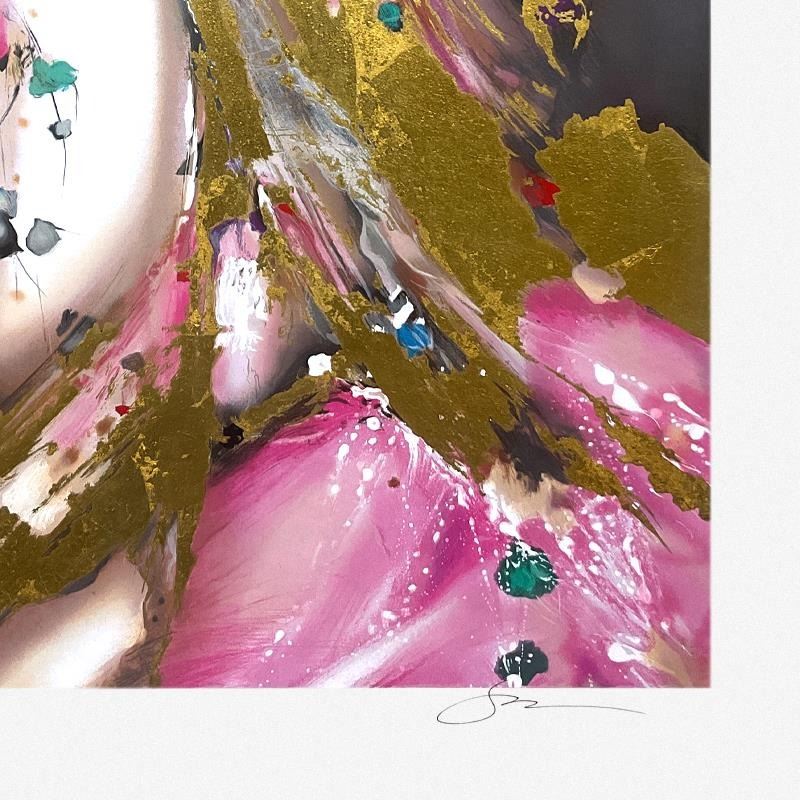 "Golden Serenade" is a limited edition printer's proof serigraph on paper by Suzanne Marie, numbered and hand signed by the artist. Includes Letter of Authenticity. Measures approx. 37" x 30" (border), 31" x 25" (image).