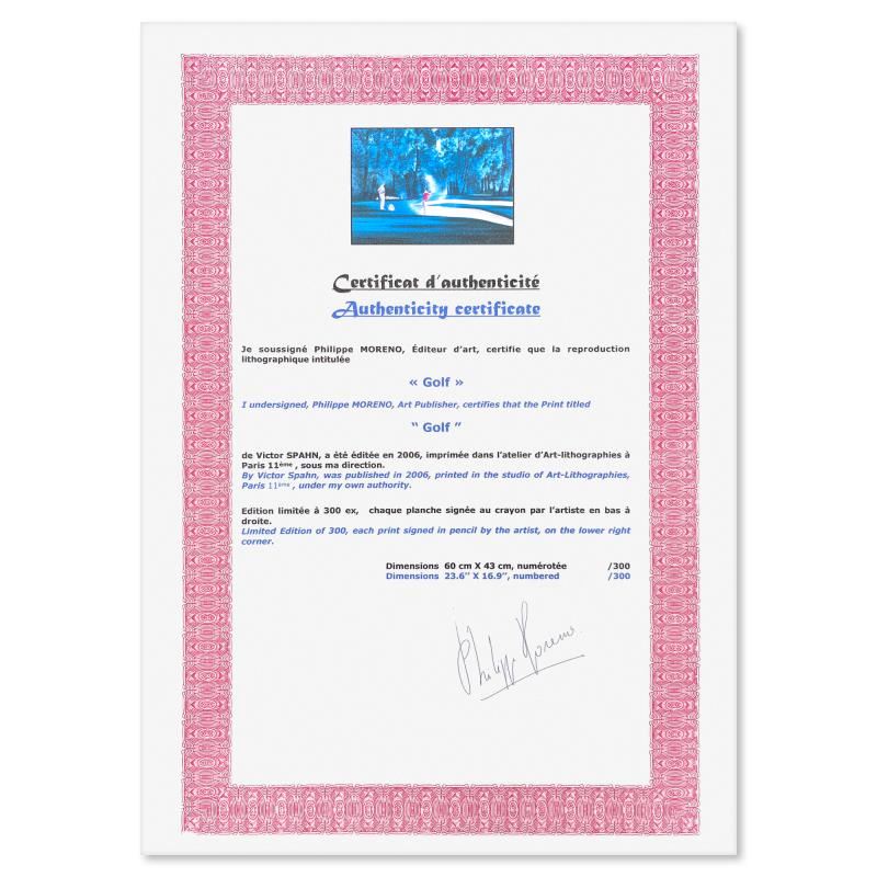 Golf is a limited edition lithograph on paper by Victor Spahn. Printed at Art-Lithographies workshop in Paris, the piece is hand signed by the artist and comes with a certificate of authenticity. Measures approximately 17 x 23.5 (image).