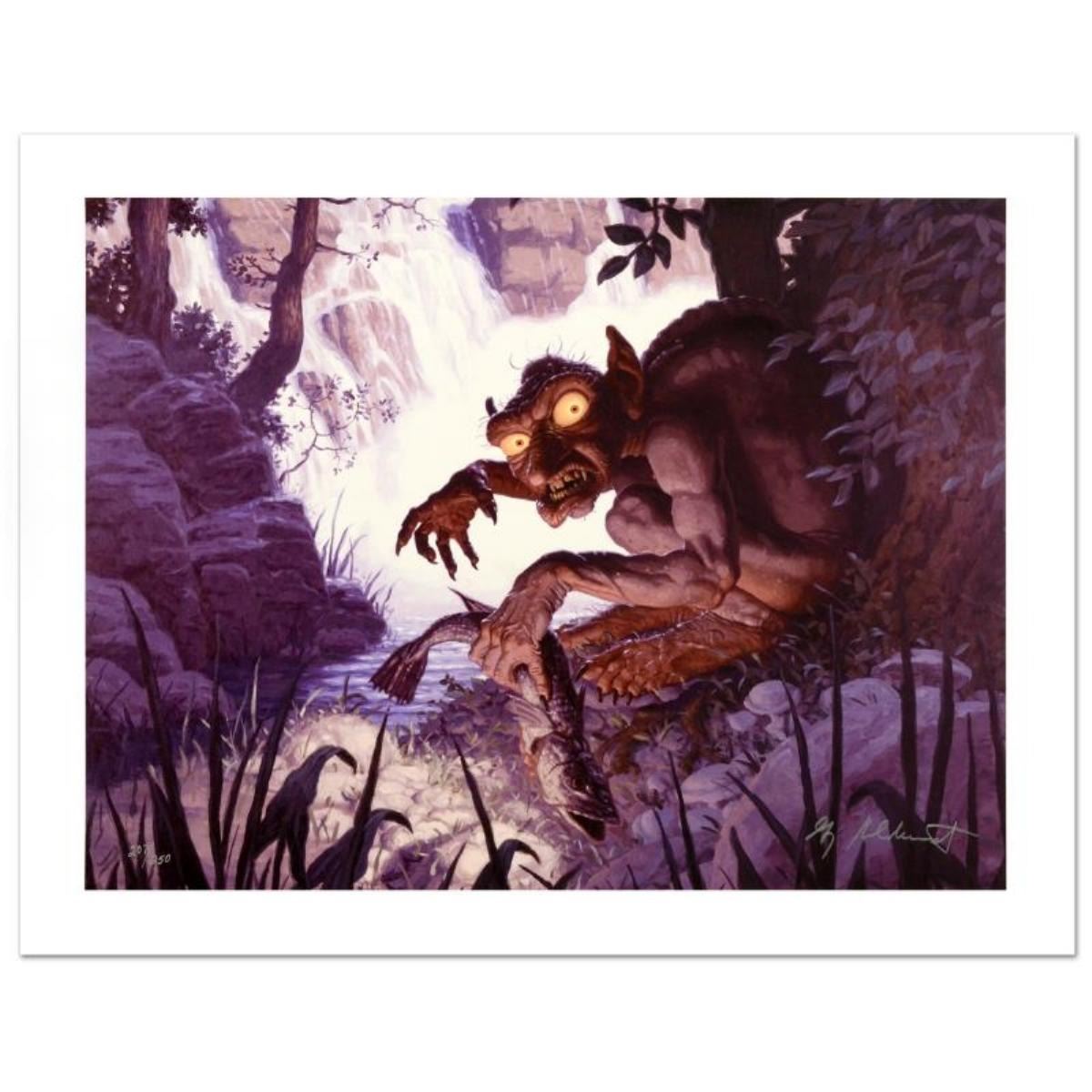 Known world wide for their fantasy and science fiction illustrations, identical twin brothers Greg and Tim Hildebrandt created an abundance of fascinating artwork, most notably their illustration work for J.R.R. Tolkien's 'The Hobbit' and 'Lord of the Rings'. "Gollum", originally created in the 1970's for Ballantine Books, is a limited edition giclee on canvas, numbered and hand signed by Greg Hildebrandt! Includes Certificate of Authenticity! Measures approx. 28" x 21" (image).