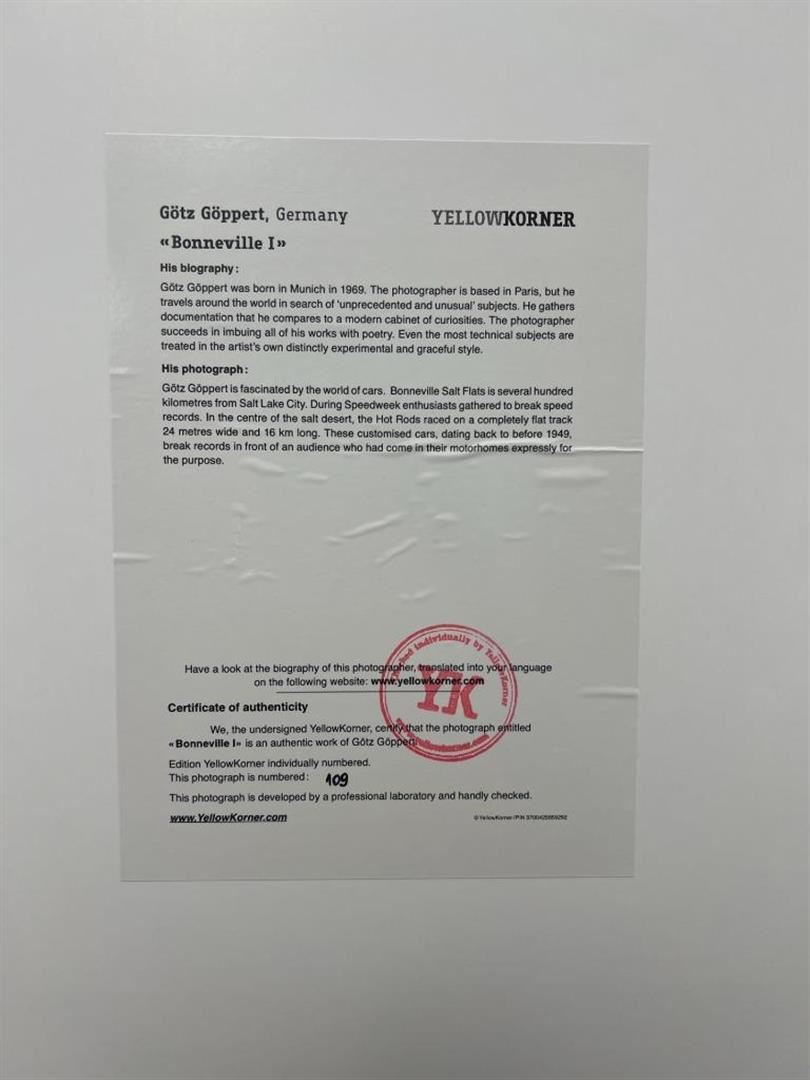 Gotz Goppert Germany Bonneville I YellowKorner Certified Photograph. Certificate of Authenticity from YellowKorner affixed to the back. Matted Dimensions 16"x20". Protected with Clear Mylar Sleeve.