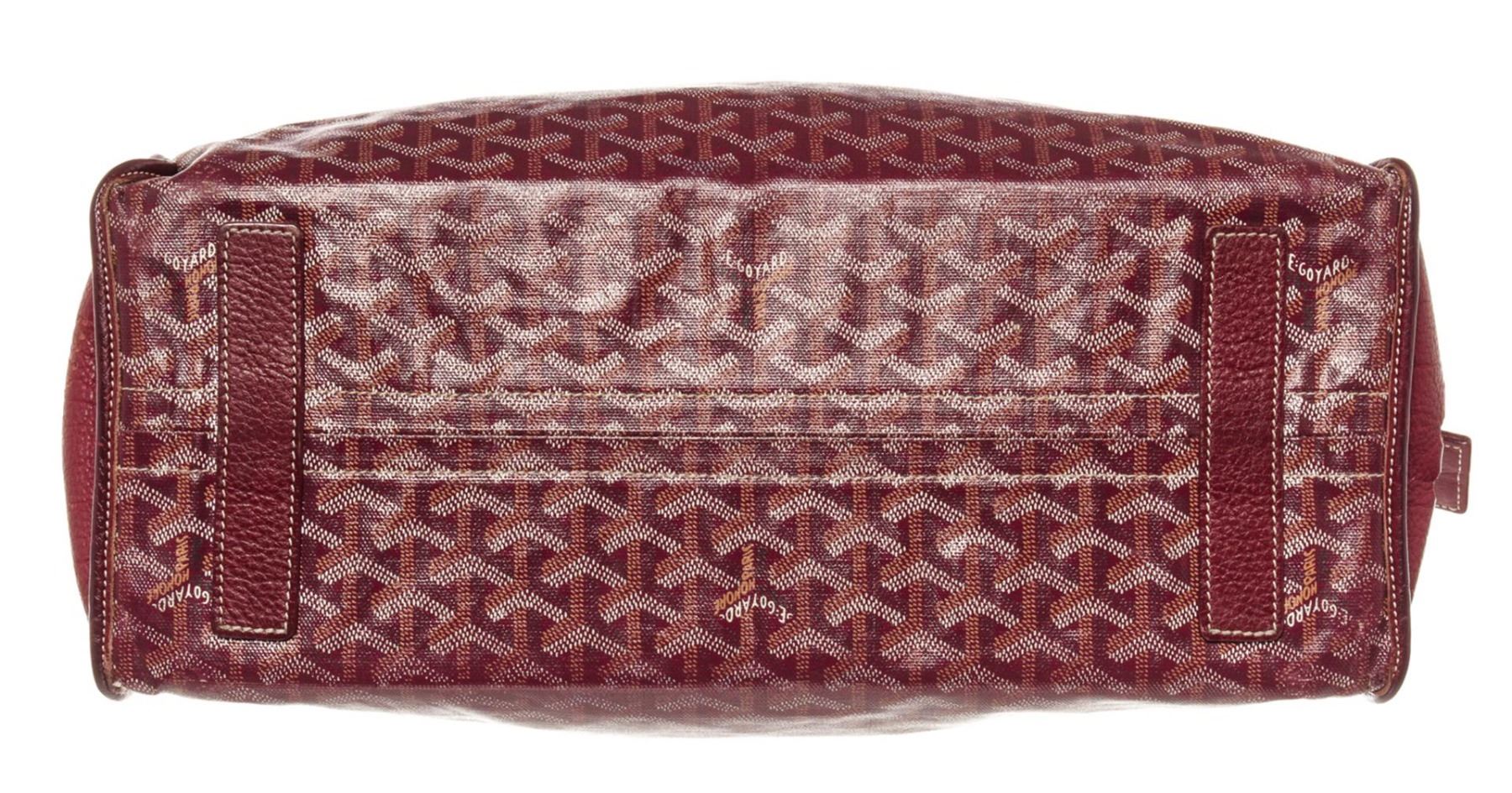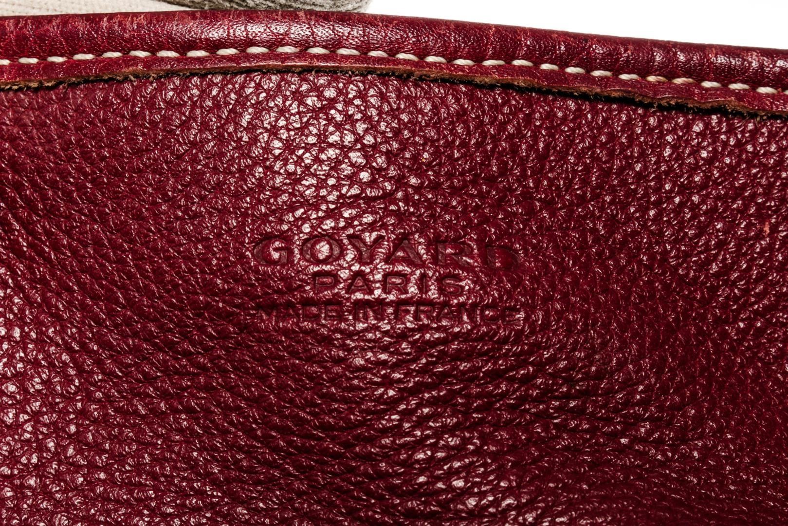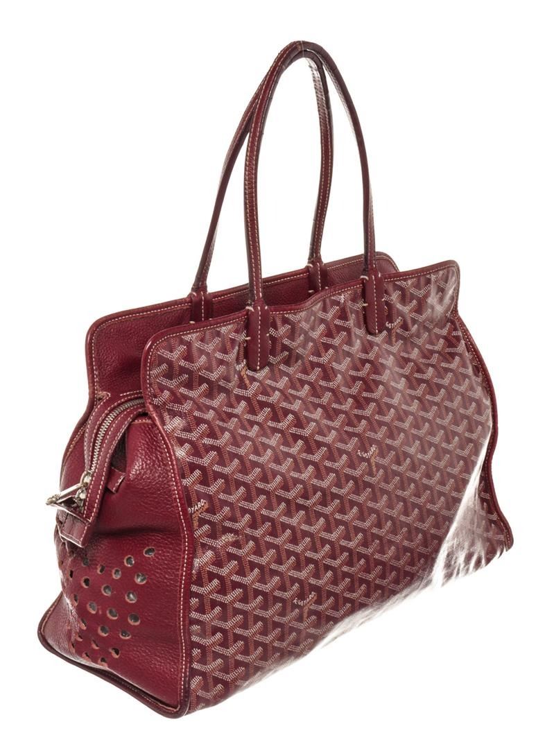 One Goyard Burgundy Goyardine Canvas Leather Sac Hardy PM Tote Bag. Item is sold AS-IS. All available information is listed in the description and shown in the photo. Burgundy Goyardine coated canvas Goyard Sac Hardy PM tote bag with silver-tone hardware, dual shoulder straps, perforated details, small pouch with stud closure, beige canvas lining and zip closure at top. Height: 12" Width: 16" Depth: 6.5" Shoulder Strap Drop: 7.5"