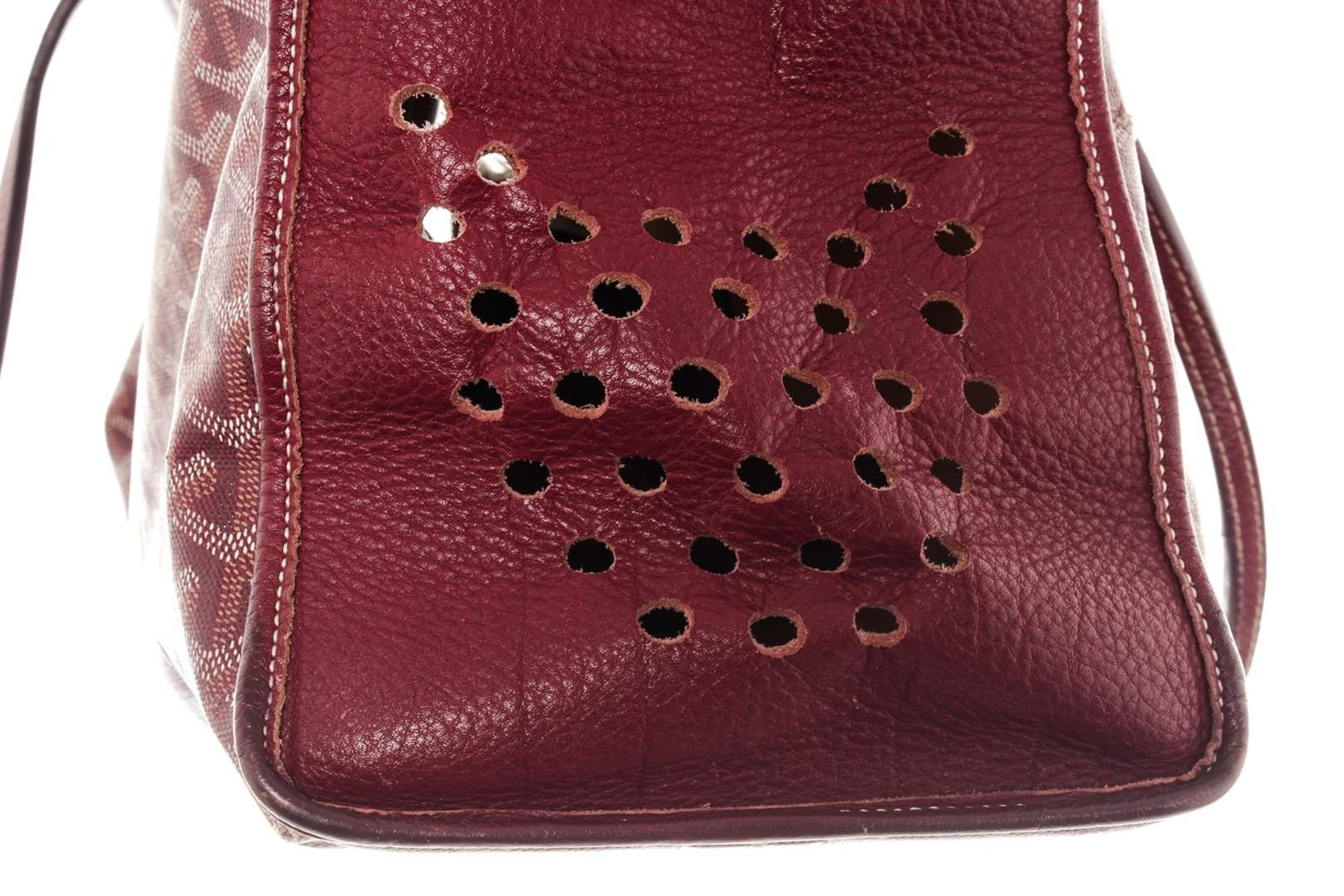 One Goyard Burgundy Goyardine Canvas Leather Sac Hardy PM Tote Bag. Item is sold AS-IS. All available information is listed in the description and shown in the photo. Burgundy Goyardine coated canvas Goyard Sac Hardy PM tote bag with silver-tone hardware, dual shoulder straps, perforated details, small pouch with stud closure, beige canvas lining and zip closure at top. Height: 12" Width: 16" Depth: 6.5" Shoulder Strap Drop: 7.5"