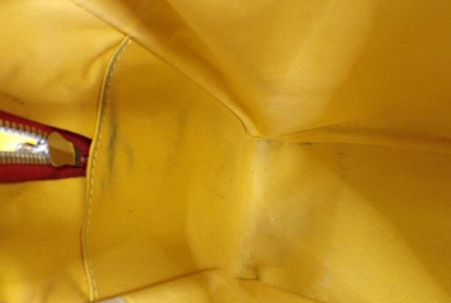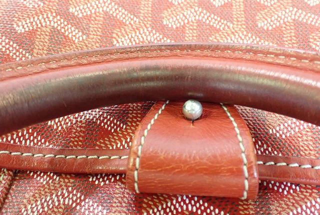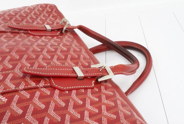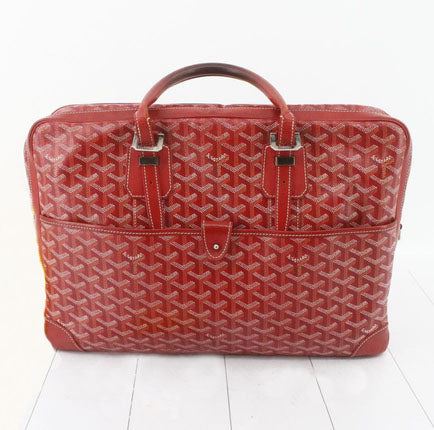 One Goyard Red Goyardine Ambassade MM Briefcase. Item is sold AS-IS. All available information is listed in the description and shown in the photo. Red Goyardine Chevron monogram Goyard Ambassade MM briefcase features dual rolled leather top handles with silver-tone buckles, a facing patch pocket, and leather trim. The wrap around zipper opens to a mango yellow fabric interior with pockets. Length: 16.5 in Height: 11.75 in Width: 4.25 in Handle Drop: 4.5 in