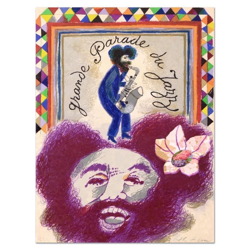 "Grande parade Du Jazz" is a limited edition lithograph on rice paper by Theo Tobiasse (1927-2012), numbered and hand signed by the artist. Includes Letter of Authenticity. Measures approx. 22.5" x 30" (image).