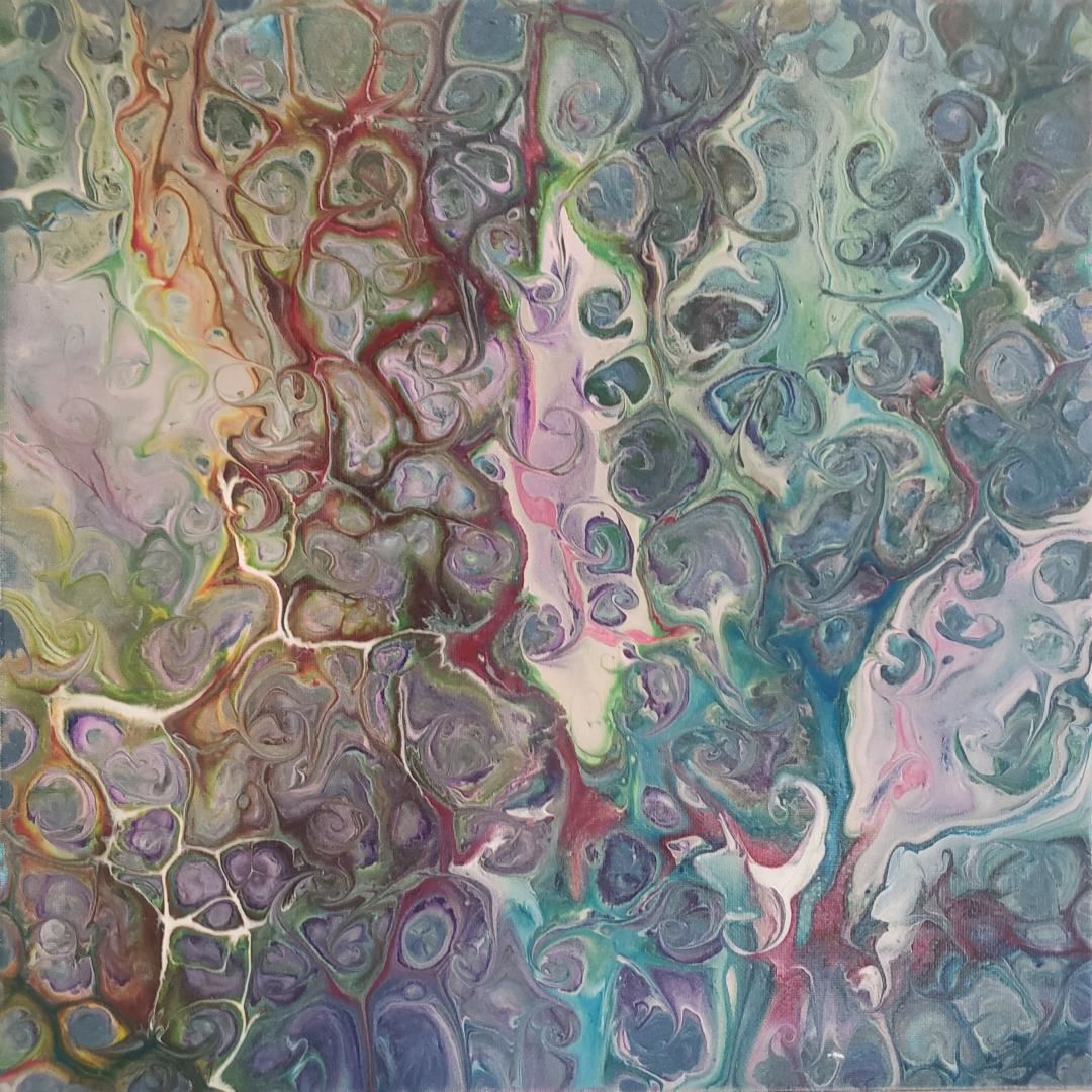 A 14x14" original acrylic on stretched canvas. Says artit Katie D. : "If I had a strong enough microsope, this how I imagine brain would look."w/COA