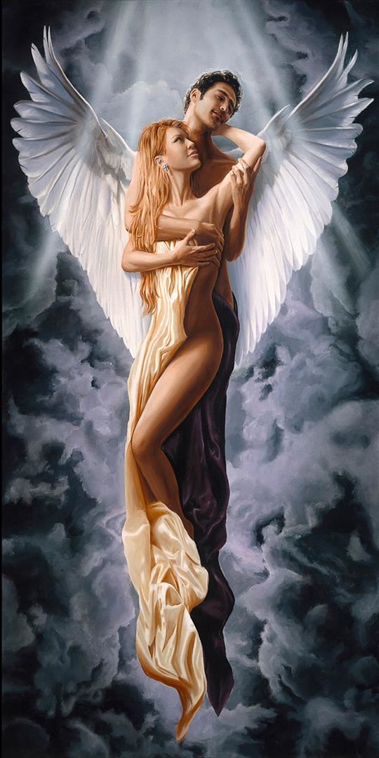 Calmly & gently lifted on air by her Guardian Angel, this DELLORCO beauty appears to us in a 48"x24" giclee on canvas, signed & numbered w/COA.
