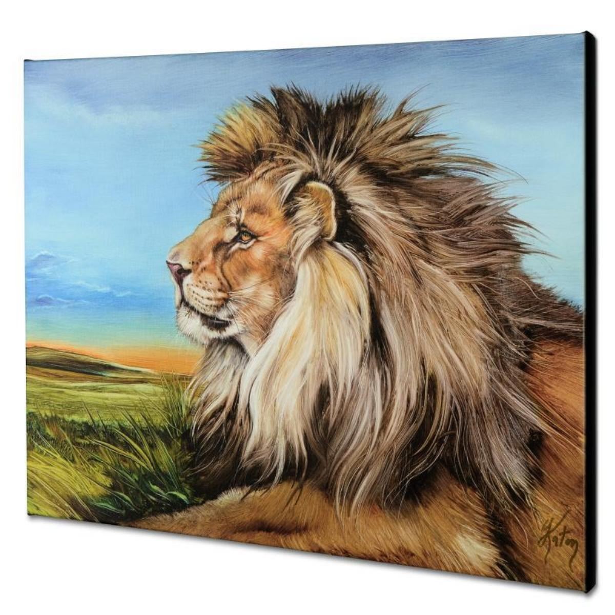 "Guardian Lion" is a limited edition giclee on canvas by Martin Katon, numbered and hand signed by the artist! This piece comes gallery wrapped. Includes Letter of Authenticity. Measures approx. 30" x 24" (image).