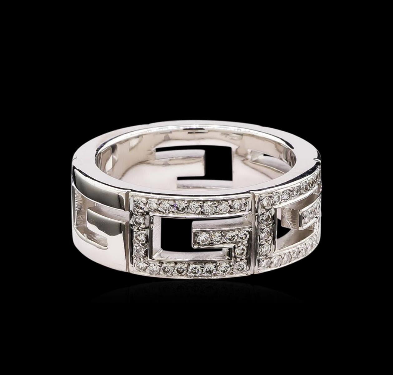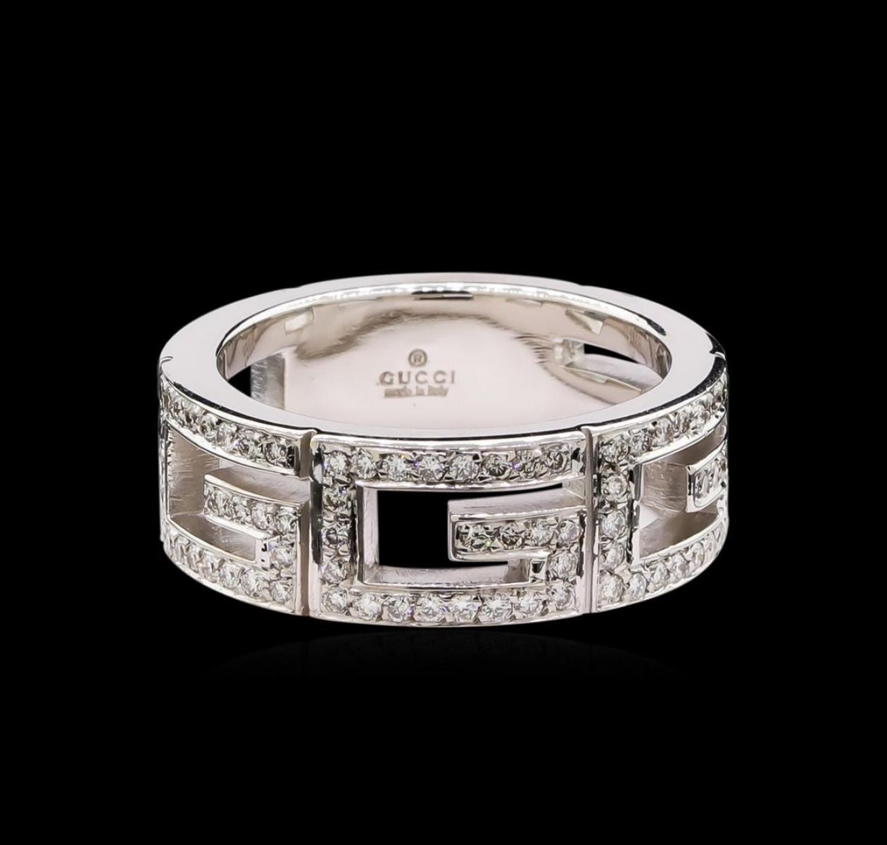 One electronically tested 18KT white gold ladies cast diamond ring with a bright polish finish. The seven millimeter wide ring features Gucci's recognizable ornamentation of three diamond pav‚ set geometric "G" panels and two polished "G" panels. Ring size 7. Trademark is GUCCI. Identified with markings of "750". Condition is good. Containing: Seventy-Two pave' set round brilliant cut diamonds, measuring 1.10 - 1.10 x 0.66mm (depth est.) approximate total weight of 72 Stones = 0.44ct. Graded in the setting. Clarity: VS-1 to VS-2. Color: F - G. Total Weight of Diamonds 0.44ct. Total Weight of Ring 10.72gm. AIG Appraised at $2,090.00.