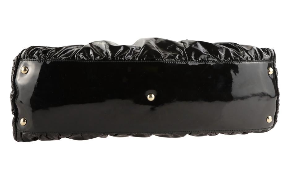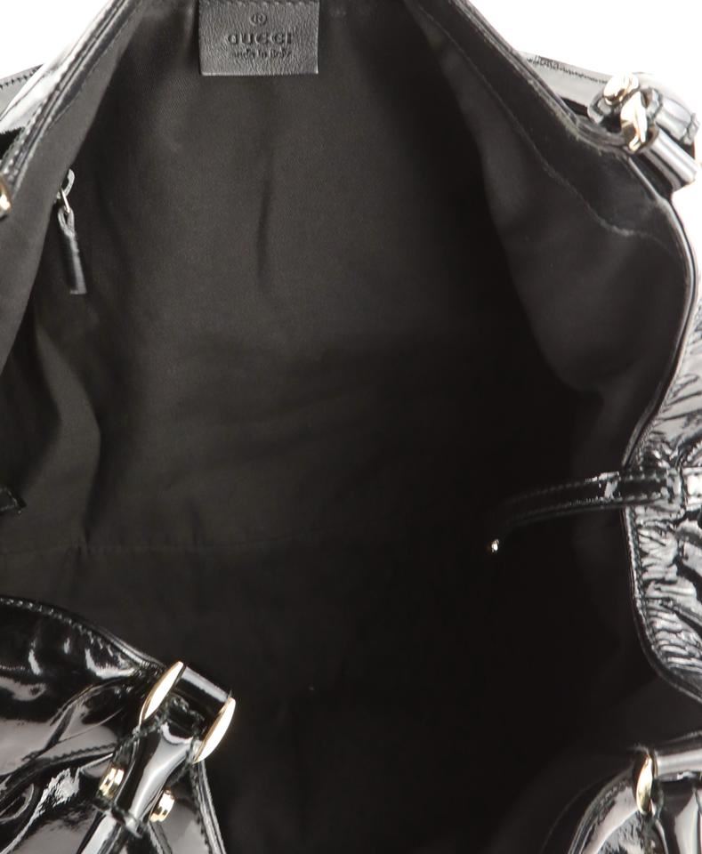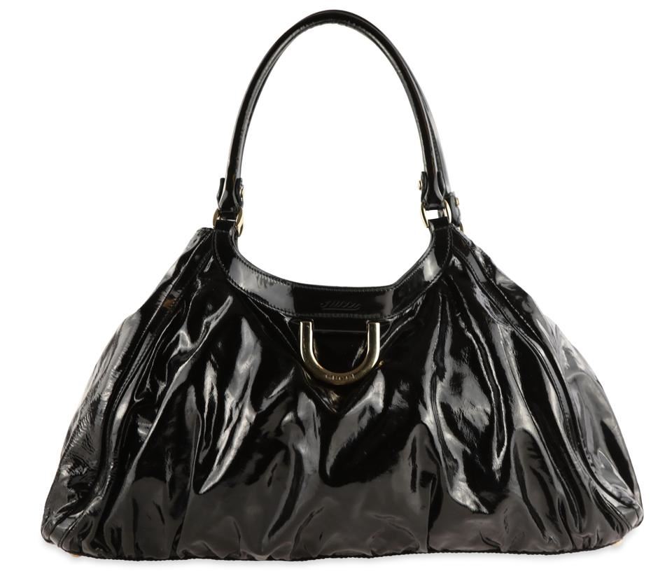 One Gucci Abbey D-ring Black Patent Leather Hobo Bag. Gucci Black Patent D-Ring Hobo Bag Handle drop . " Dual rolled leather top handles Carry this bag in the crook of the arm or over the shoulder at longest point " Slouchy construction Black patent leather Gold-tone hardware D-ring with embossed logo at front Protective feet at base Black canvas lining Interior pockets: slip, zip Made in Italy