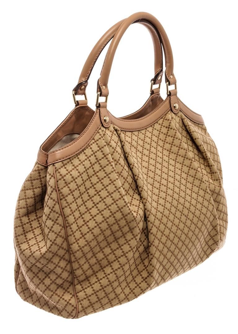 Gucci Beige Canvas Sukey/Diamante Tote Bag. All available information is listed in the description and shown in the photos. Gucci Beige Canvas Sukey/Diamante Tote Bag with brown canvas, diamante print & sukey logo, gold-tone hardware, dual rolled handles, canvas lining & single interior pocket, snap closure at top. Height: 11.5" Width: 14.75" Depth: 5", Handle Drop: 6" / 29.21 x 37.46 x 12.7 Cm