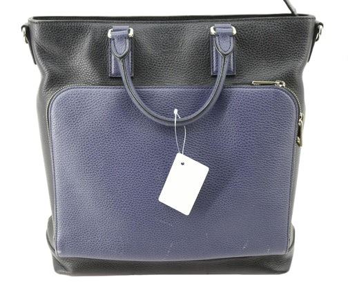 One Gucci Black Navy Blue Leather Cosmopolis Tote Bag. Item is sold AS-IS. All available information is listed in the description and shown in the photo. Bicolor black and navy blue leather Gucci Cosmopolis tote bag with silver-tone hardware, dual-rolled leather handles, front zip pocket, zip closure at top that opens to a black jacquard lining with zip and slip pockets. Handle Drop 4", Height 13.5", Width 12.5", Depth 4.5"