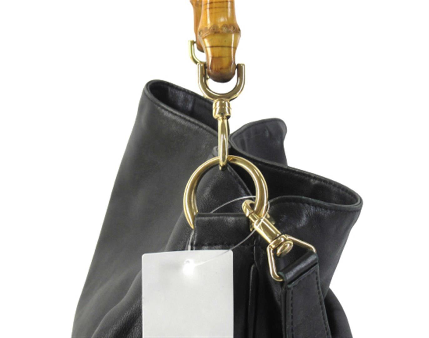 One Gucci Black Nylon Bamboo 2Way Shoulder Bag. Item is sold AS-IS. All available information is listed in the description and shown in the photo. Black nylon Gucci Bamboo 2Way shoulder bag with gold-tone hardware, black leather trim, bamboo handle & single shoulder strap, black nylon lining & single interior pocket and snap closure at top. Height: 12.5" Width: 17" Depth: 3" Shoulder Strap Drop: 16.5" Handle Drop: 7"