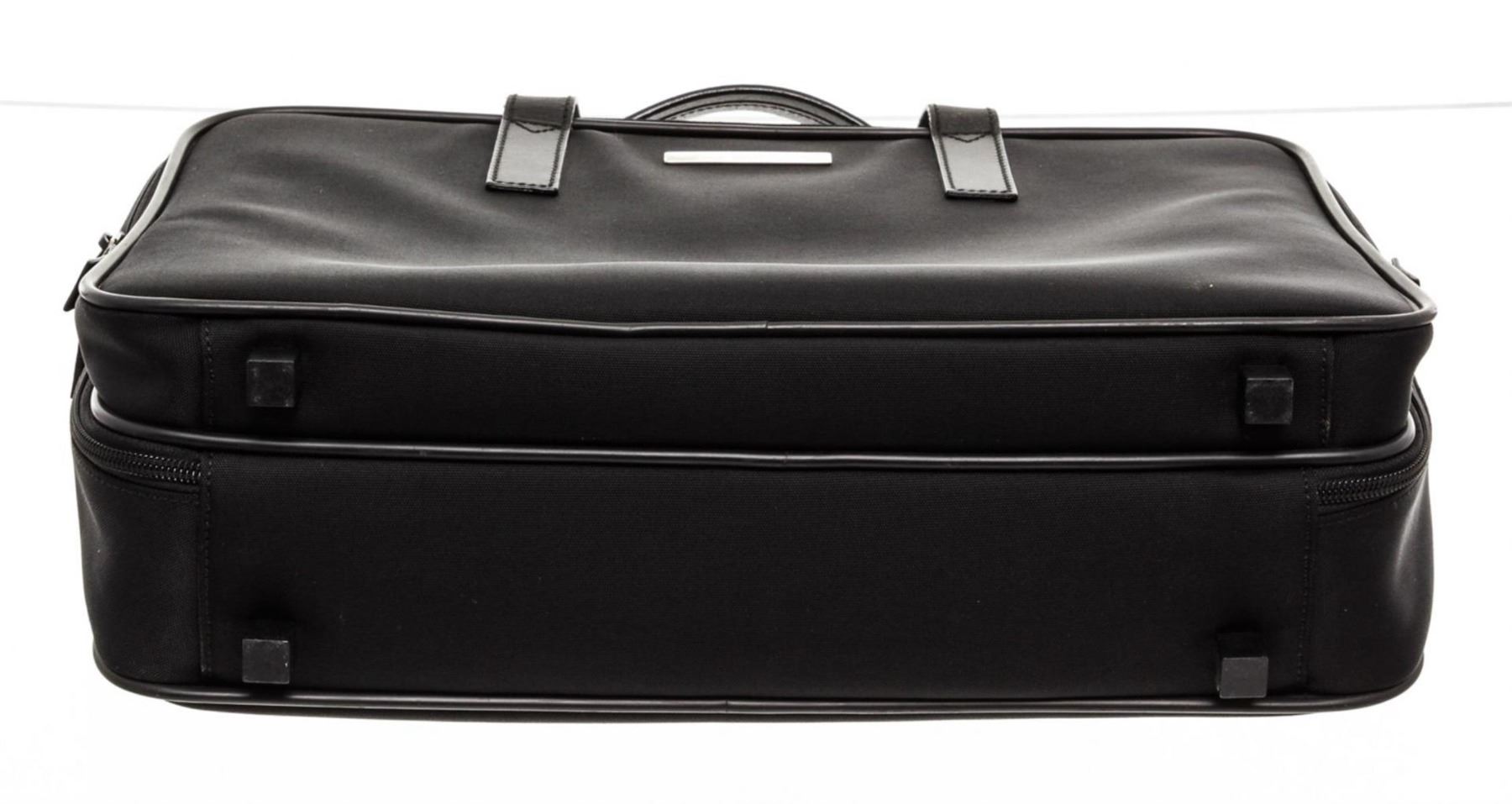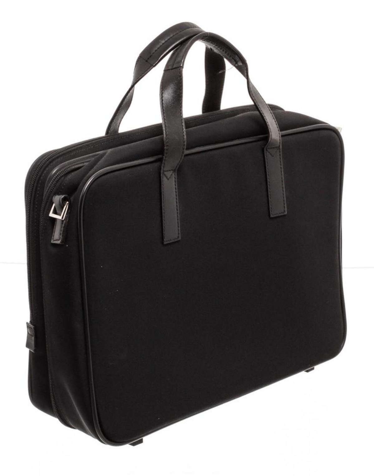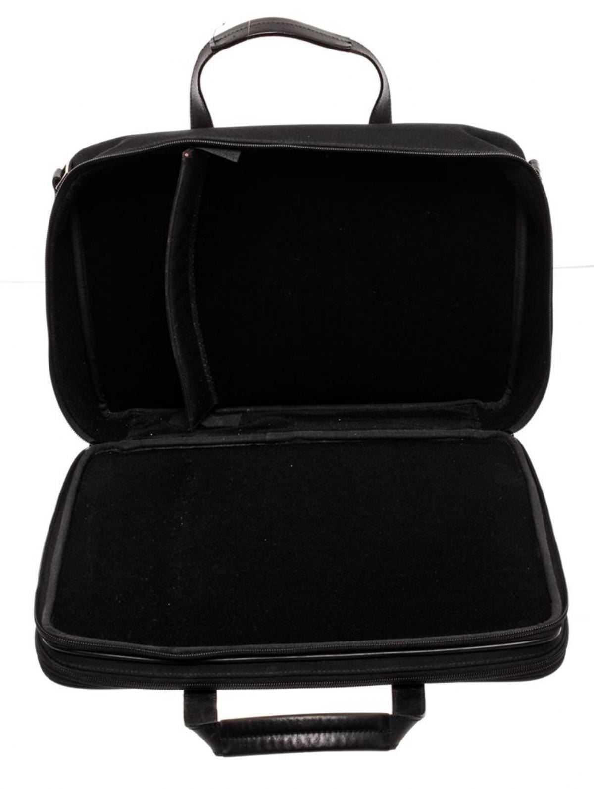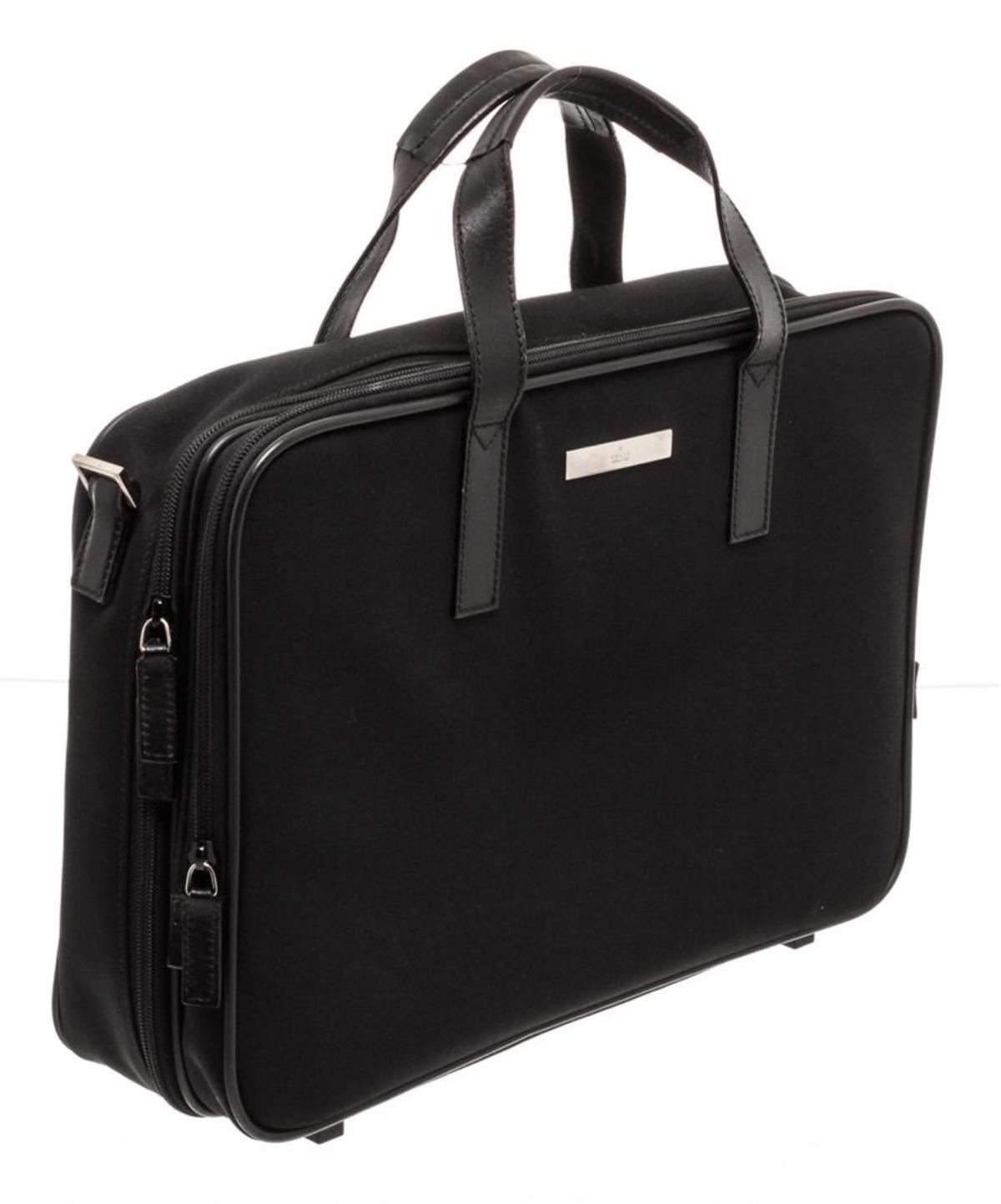 Crafted out of black nylon, black leather trim, and silver-tone hardware. Inner black canvas lining.