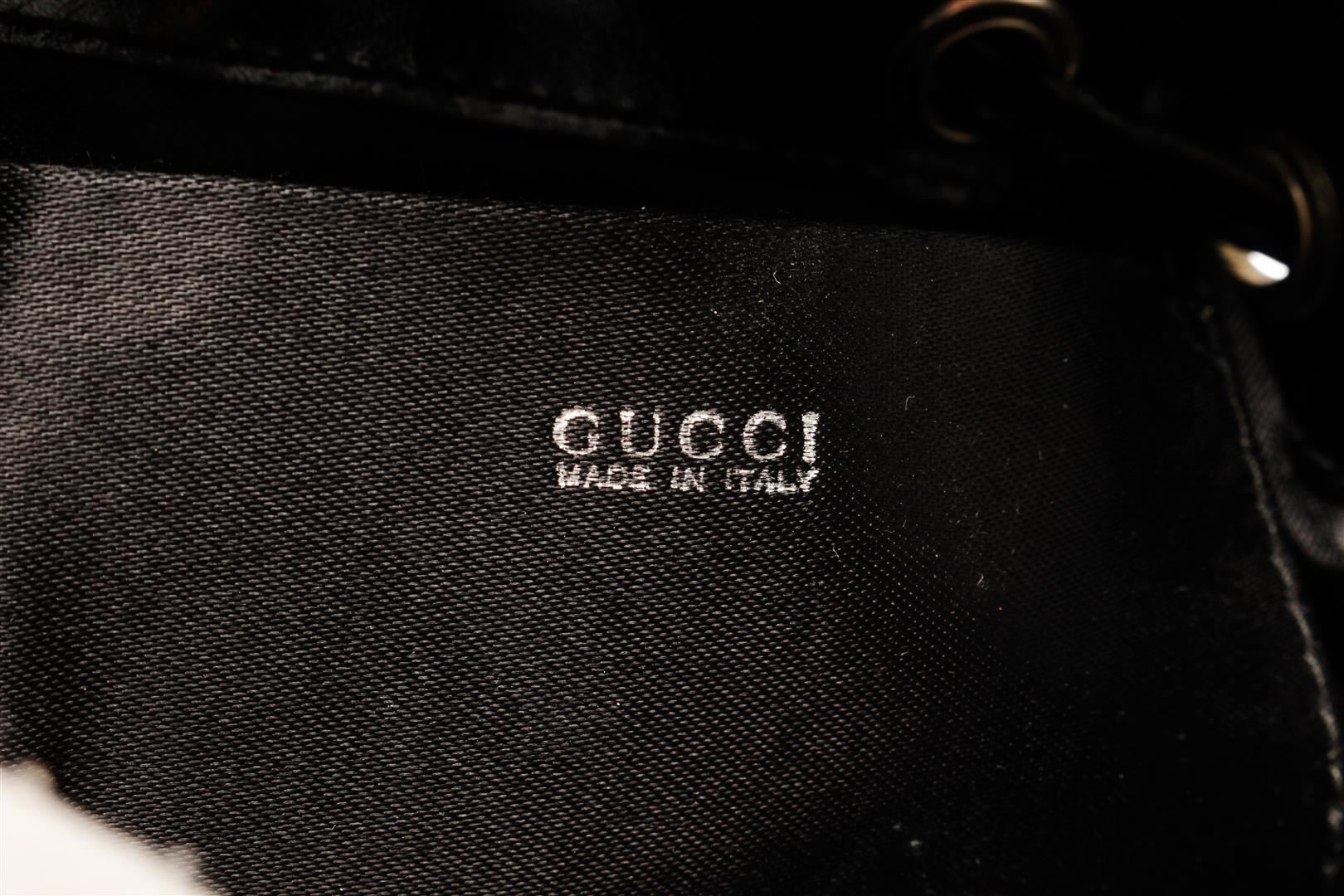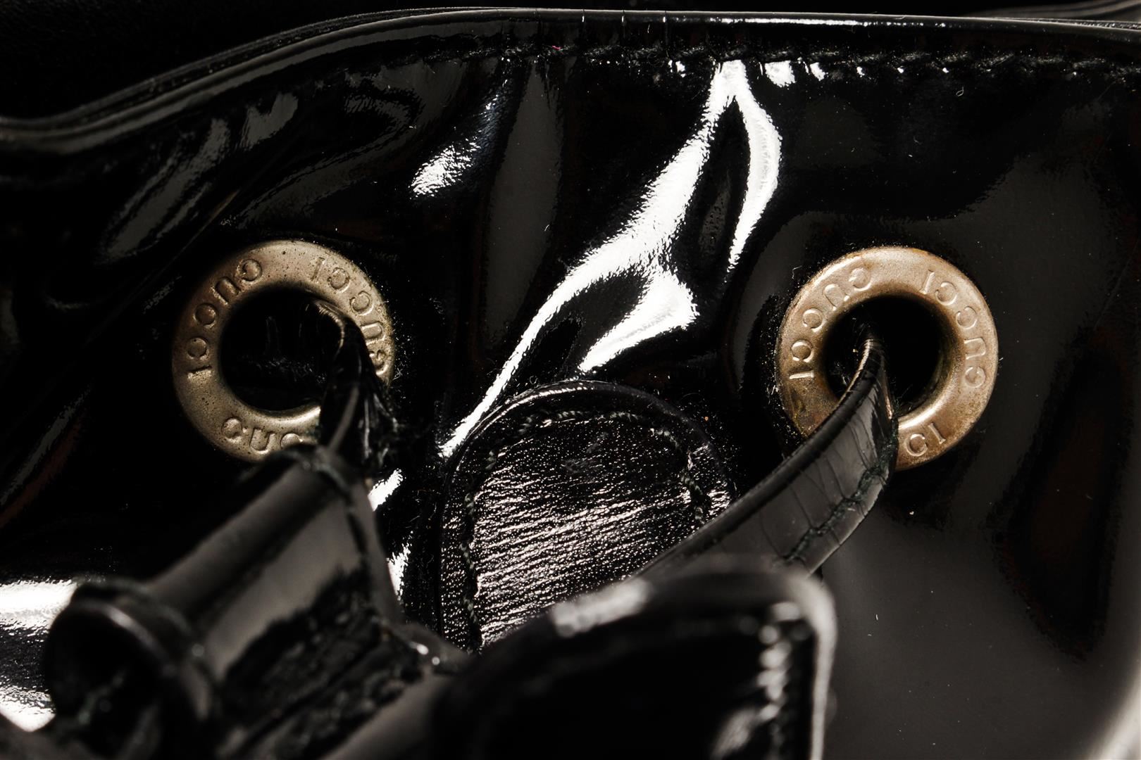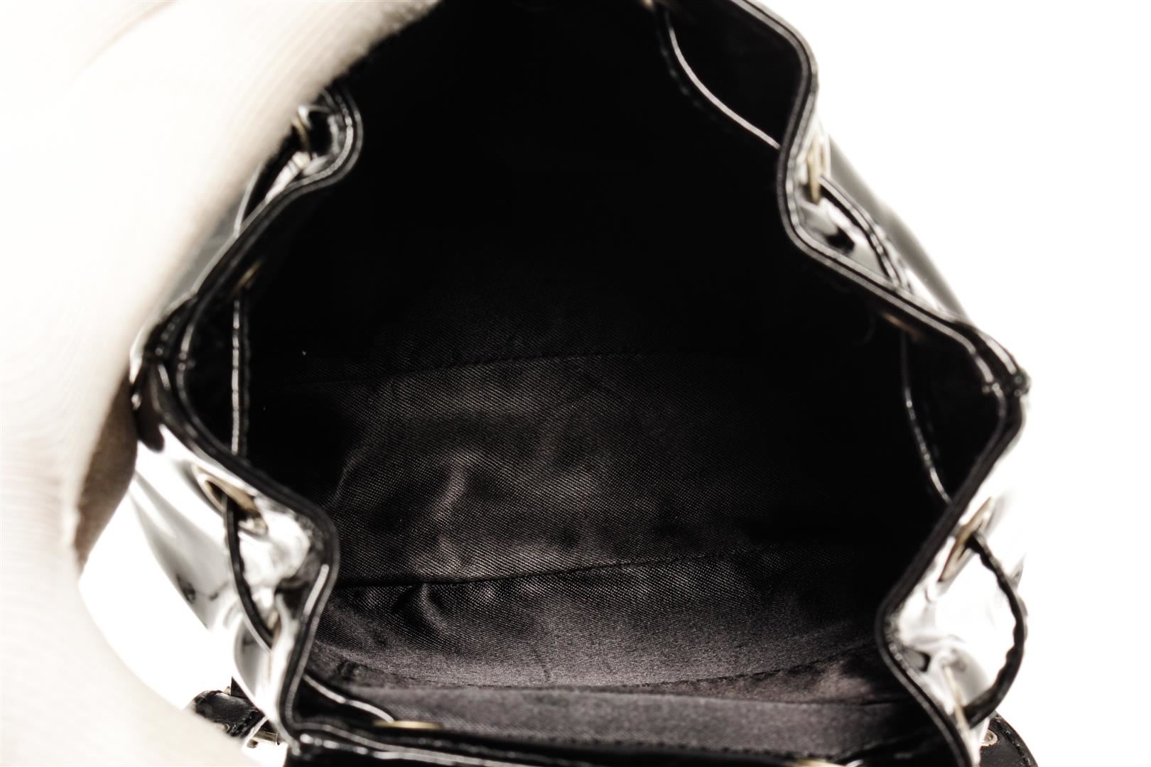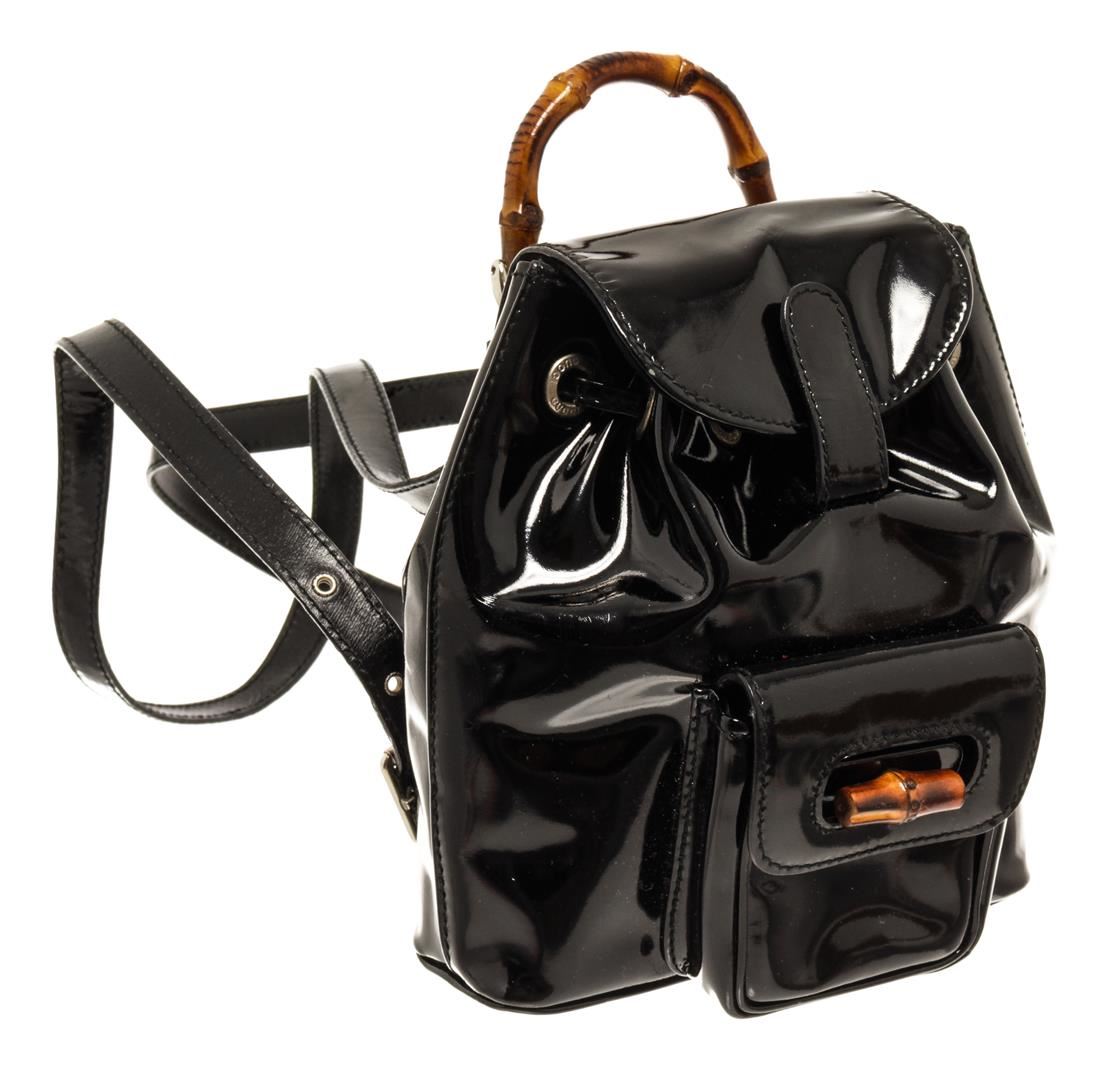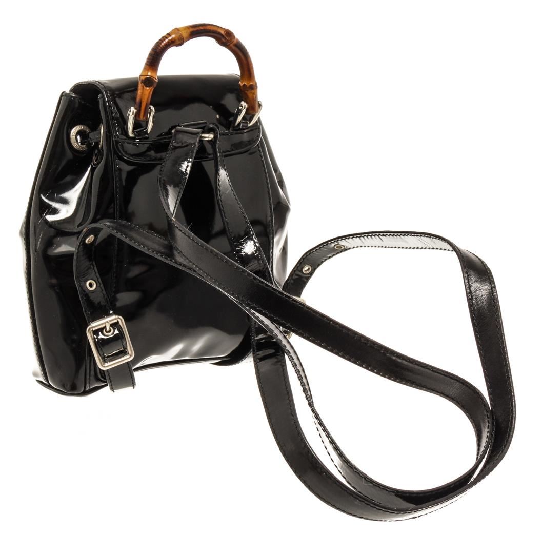 Gucci Black Patent Leather Bamboo Backpack. All available information is listed in the description and shown in the photos. Gucci Black Patent Leather Bamboo Backpack with bamboo top handle, fabric lining, silver tone hardware, exterior pocket, drawstring, snap closure