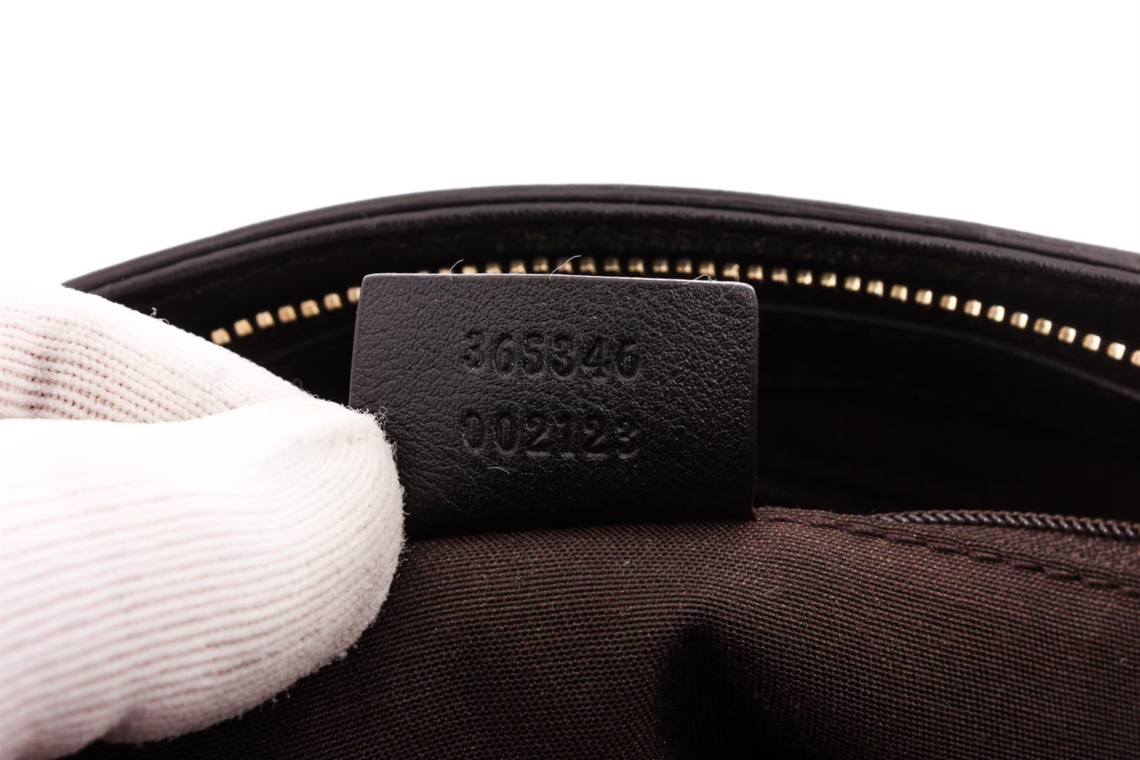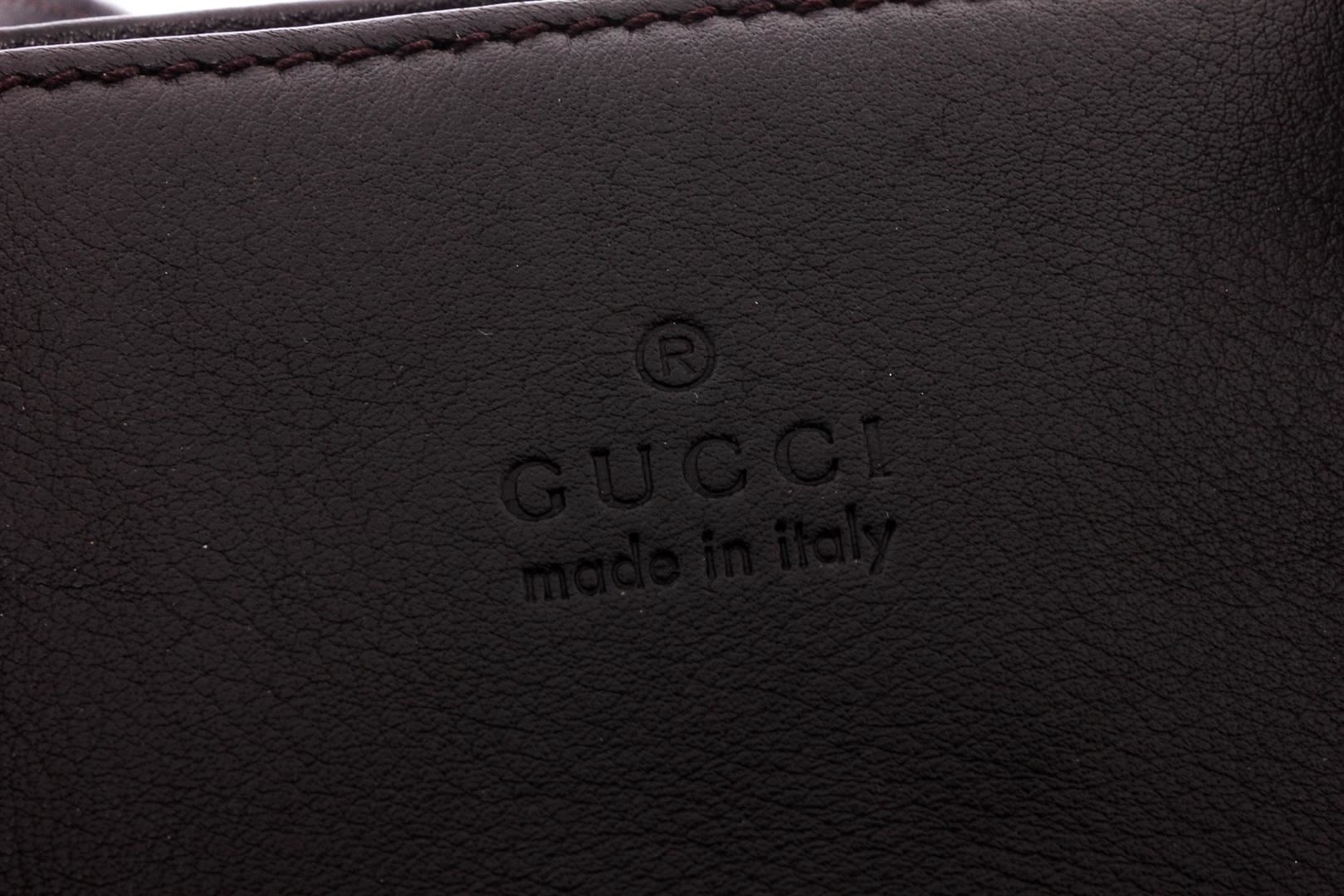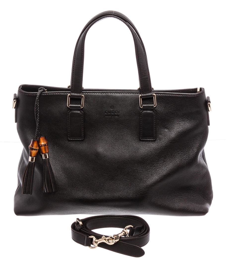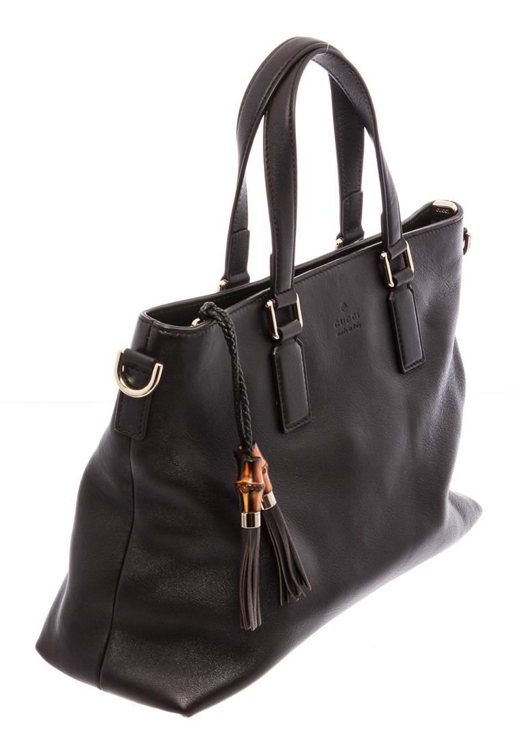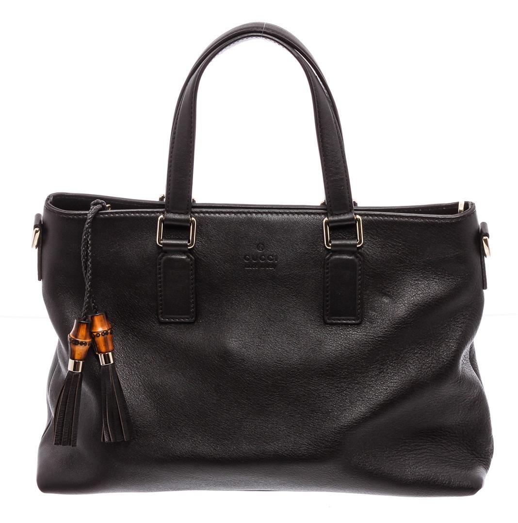 Black pebbled leather Gucci tote bag with silver-tone hardware, dual flat top handles, optional flat adjustable shoulder strap, brown canvas lining, three pockets at interior; one with zip closure and zip closure at top featuring bamboo tassel accents.