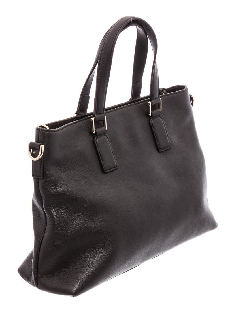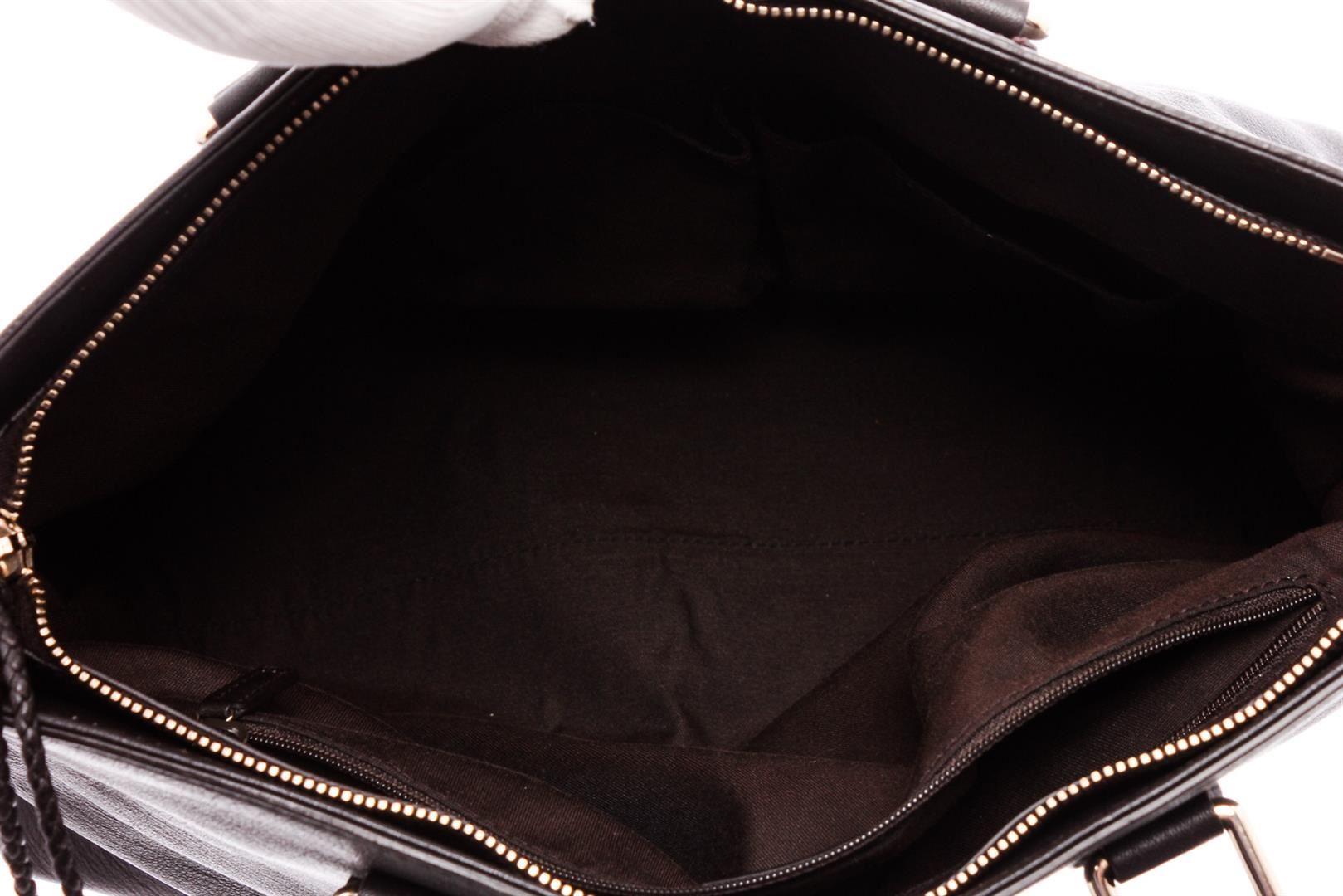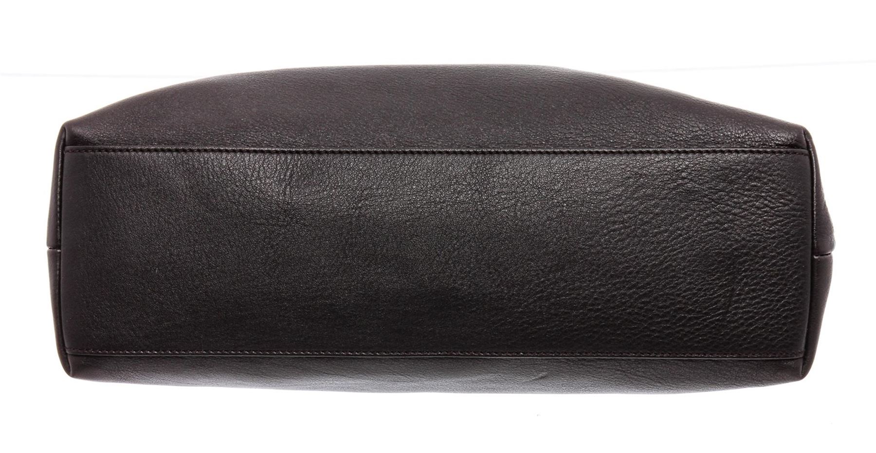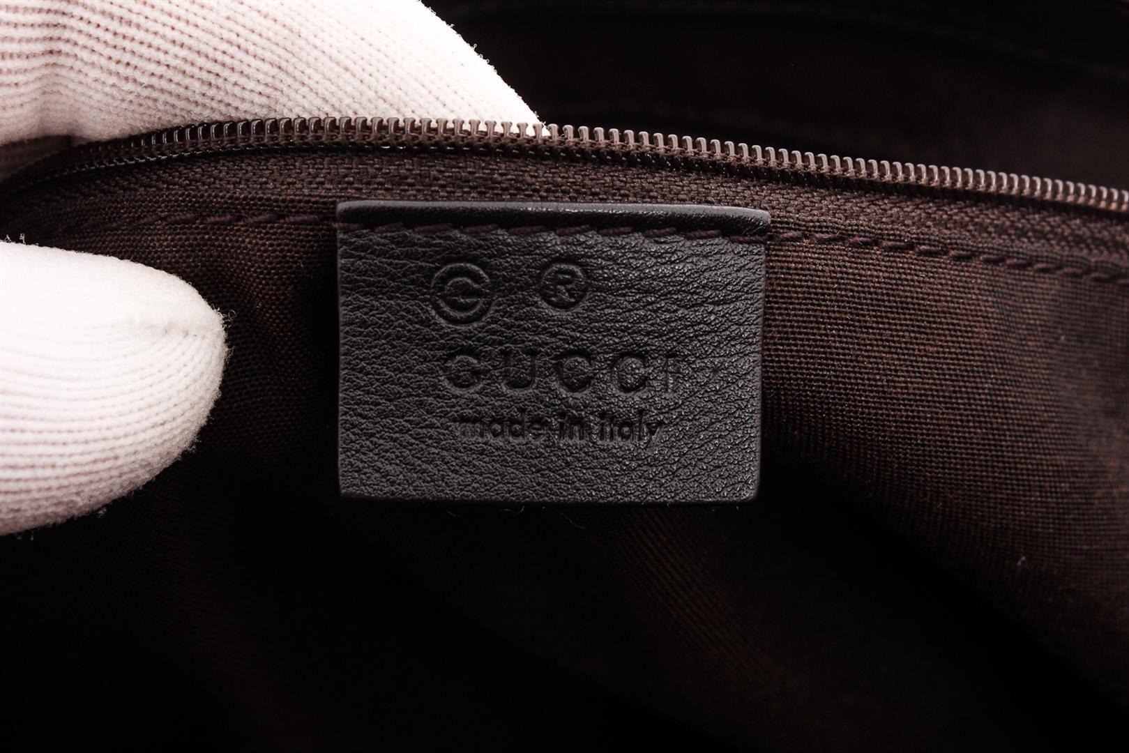 Black pebbled leather Gucci tote bag with silver-tone hardware, dual flat top handles, optional flat adjustable shoulder strap, brown canvas lining, three pockets at interior; one with zip closure and zip closure at top featuring bamboo tassel accents.
