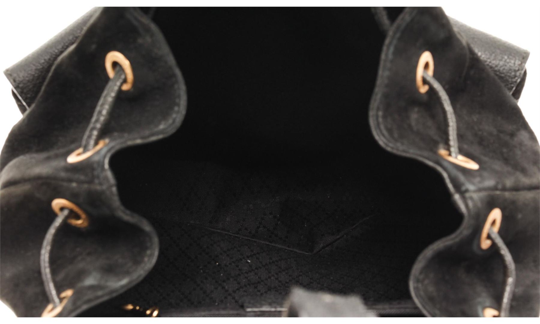 Gucci Black Suede Medium Vintage Bamboo Backpack. All available information is listed in the description and shown in the photos. Gucci Black Suede Medium Vintage Bamboo Backpack with top bamboo handle, two exterior pockets, two leather back straps, fabric lining, interior zipper pocket and buckle closure. Height: 12 in (30.48 cm), Width: 12 in (30.48 cm), Depth: 4 in (10.16 cm)