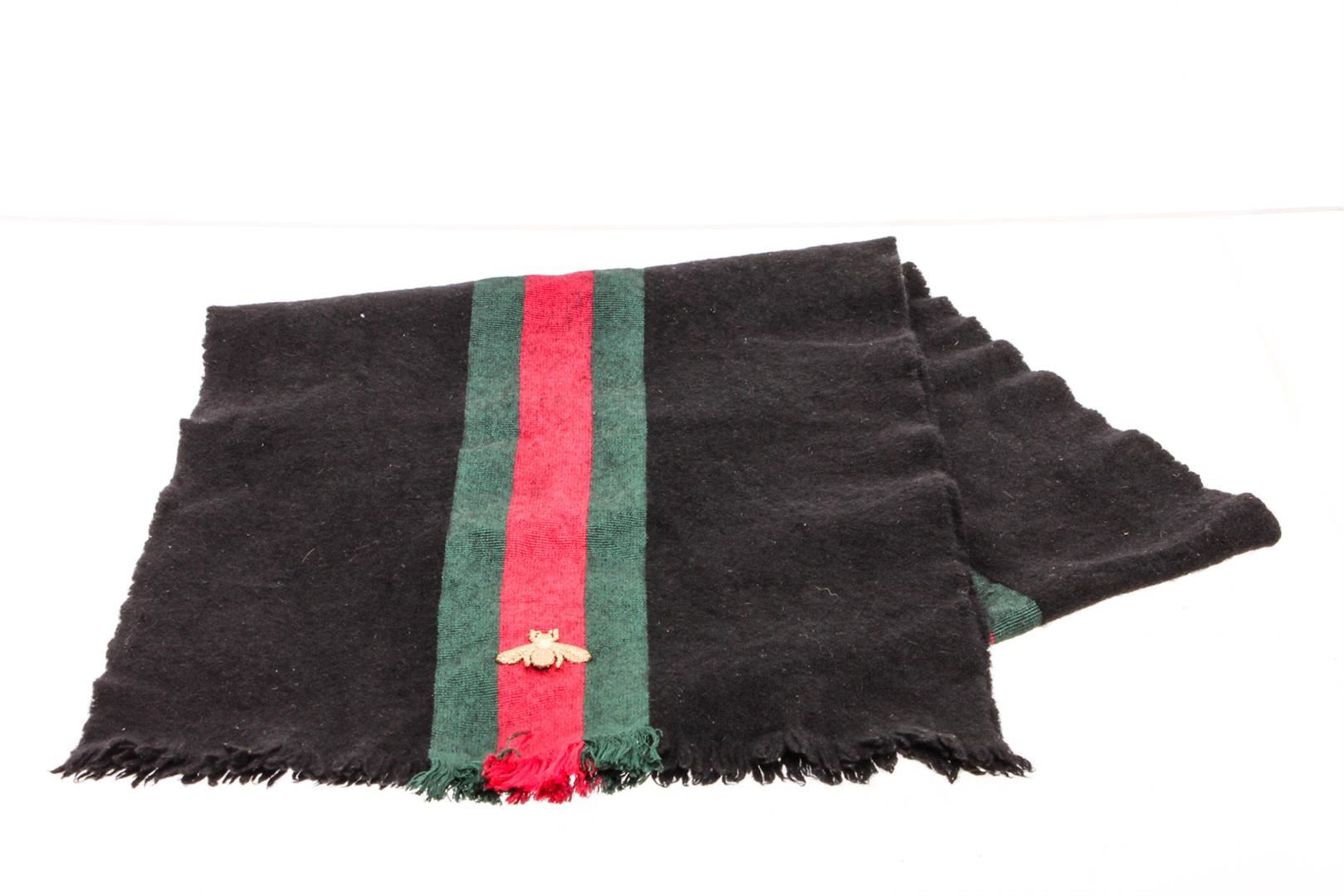 Gucci Black Web Wool Cashmere Bee Scarf, black and multicolor Gucci woven scarf with Web detail and gold bee embroidered at front with raw-edge tri