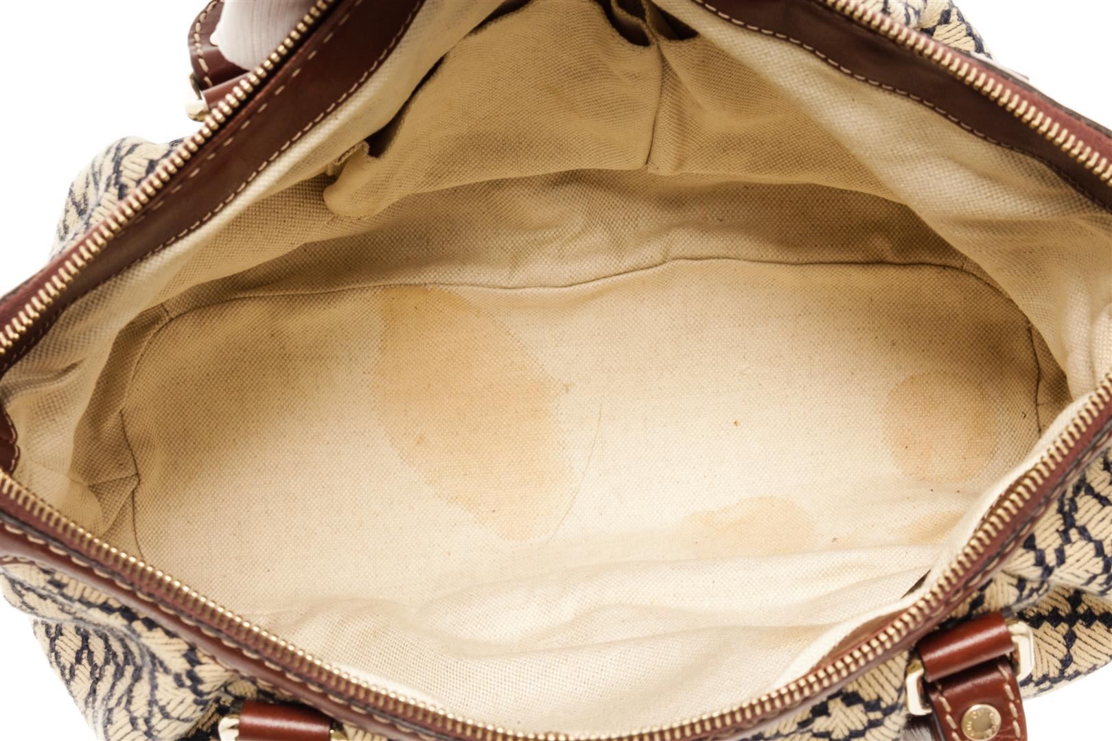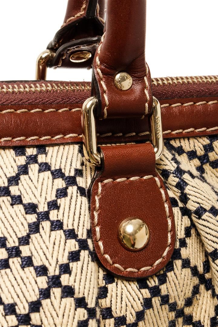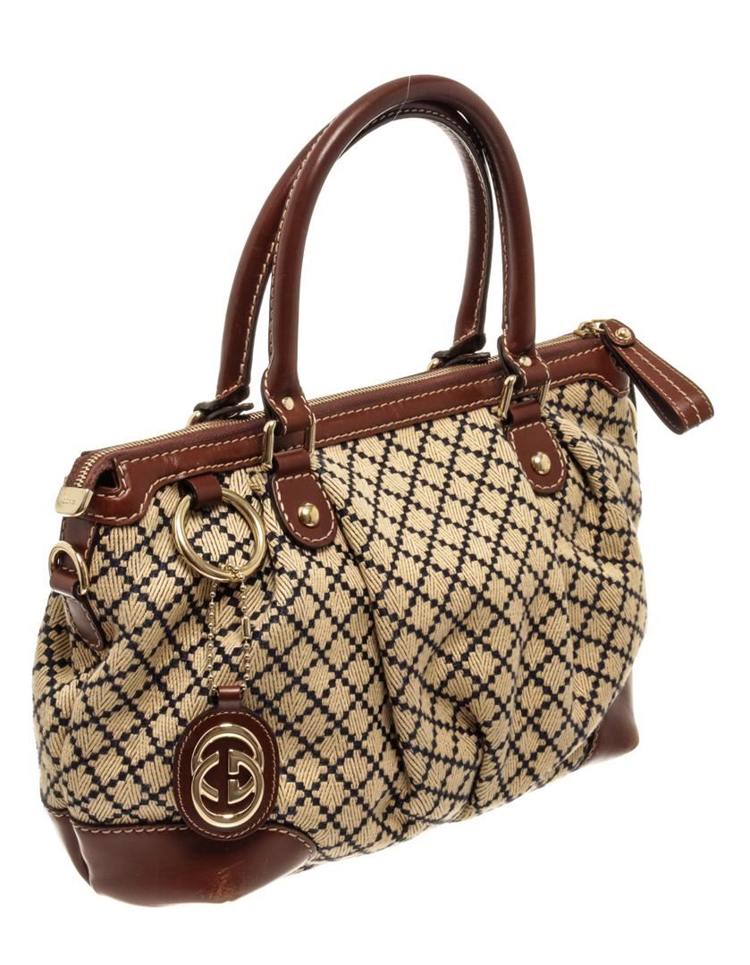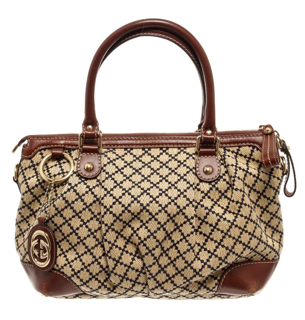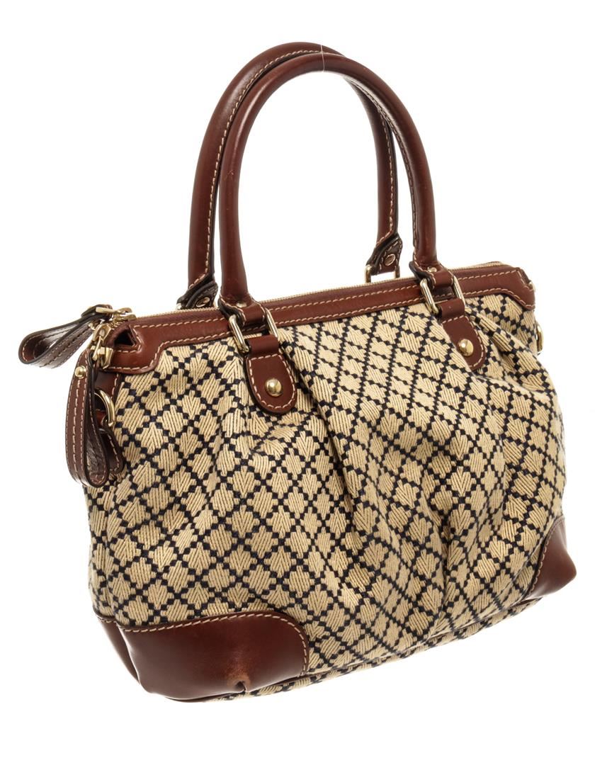 One Gucci Brown Canvas Diamante Shoulder Bag. Item is sold AS-IS. All available information is listed in the description and shown in the photo. Gucci Brown Canvas Diamante Shoulder Bag with gold-tone hardware, handles, canvas lining & three interior pockets, zip closure at top. Please note: some discoloration on lining. 8.25"x11.25"x4.75" / 20.95 x 28.57 x 12.06 Cm, Shoulder Strap Drop: 4.5"