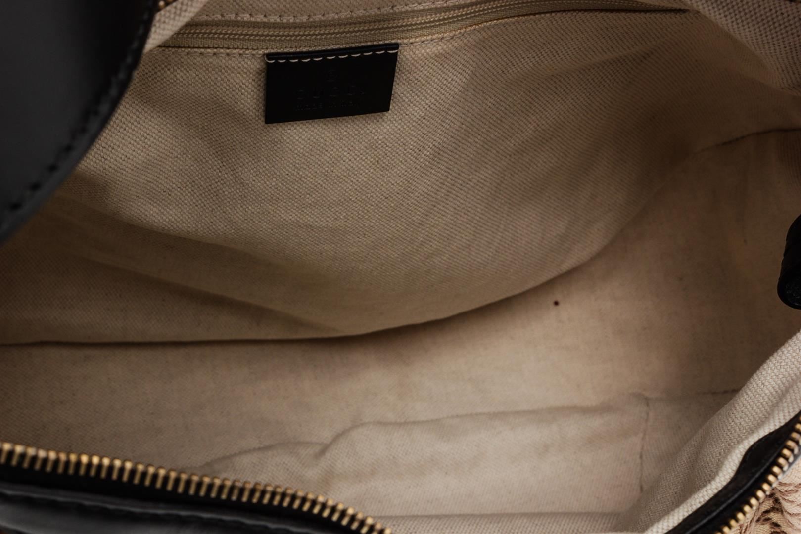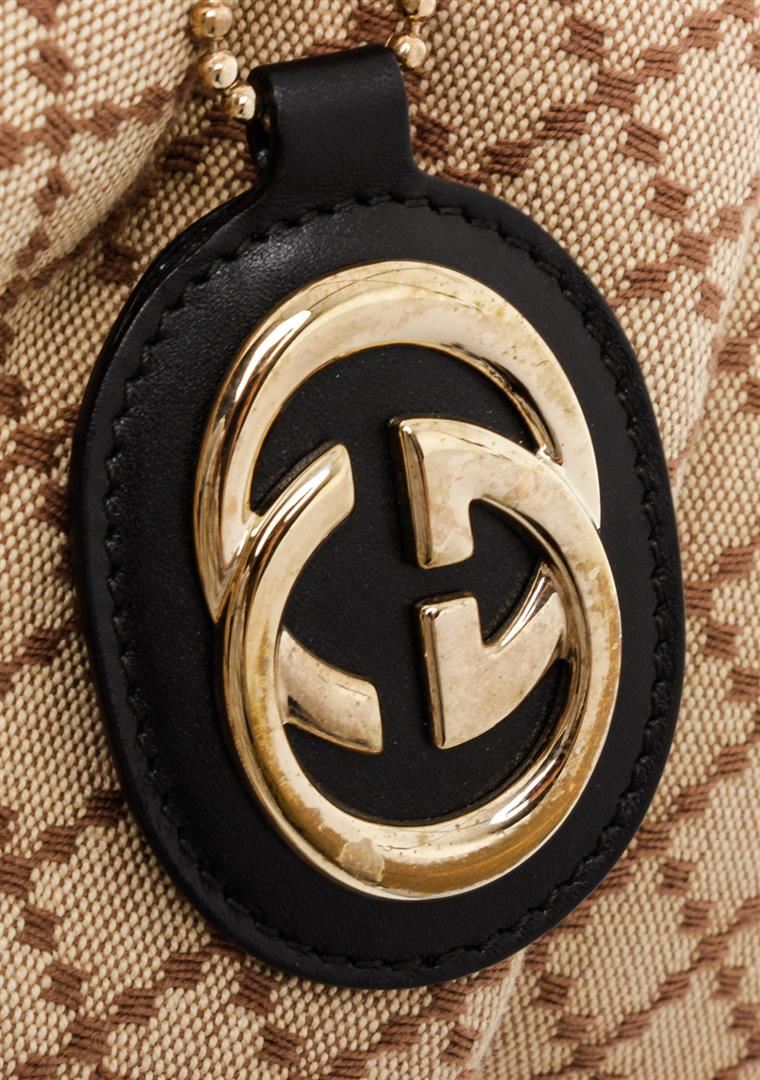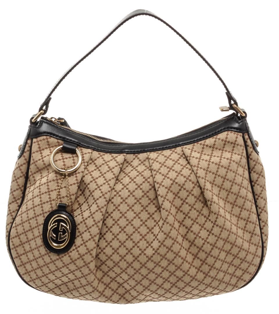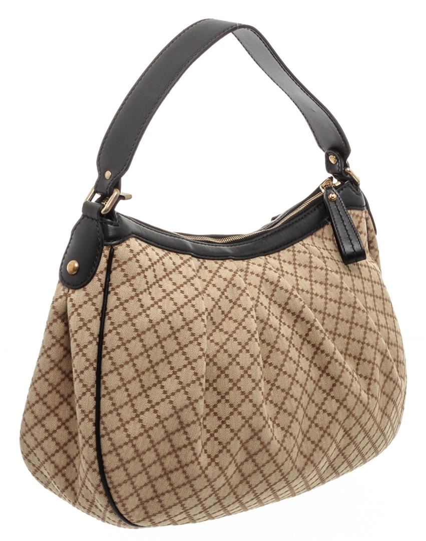 Gucci brown Diamante canvas shoulder hobo bag with black leather trim, cream canvas lining, two interior slip pockets, interior zip pocket, and zip top closure.