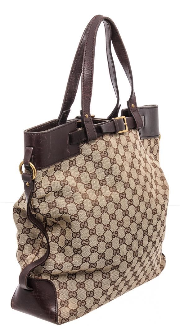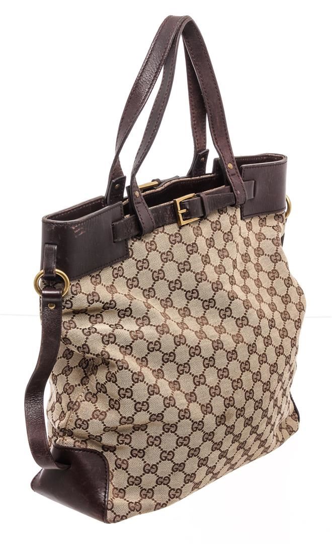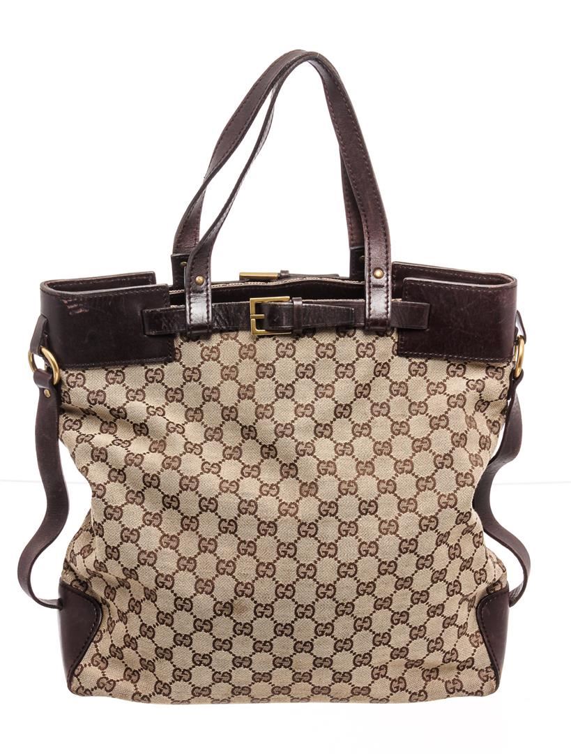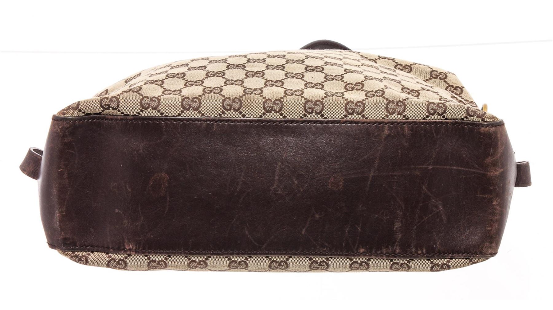 Brown and beige GG canvas Gucci tote bag with gold-tone hardware, dual flat handles, chocolate leather trim, brown canvas lining, and one interior pocket with zip closure.
