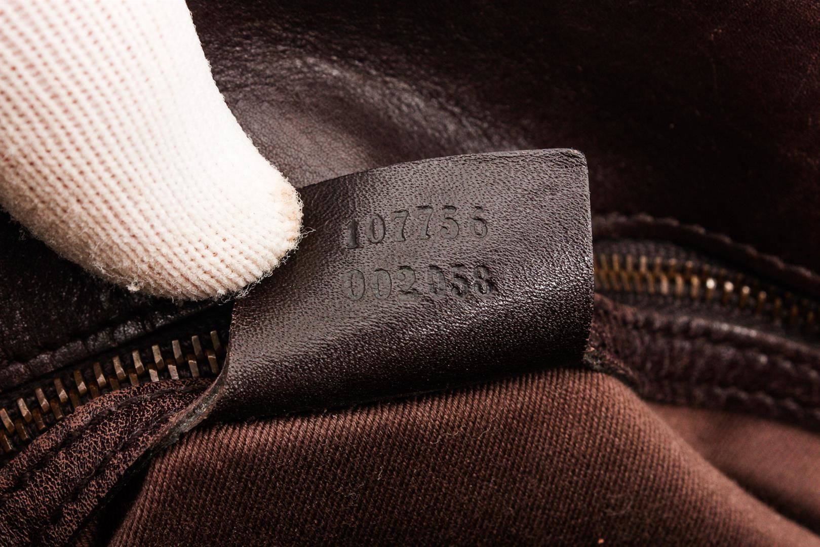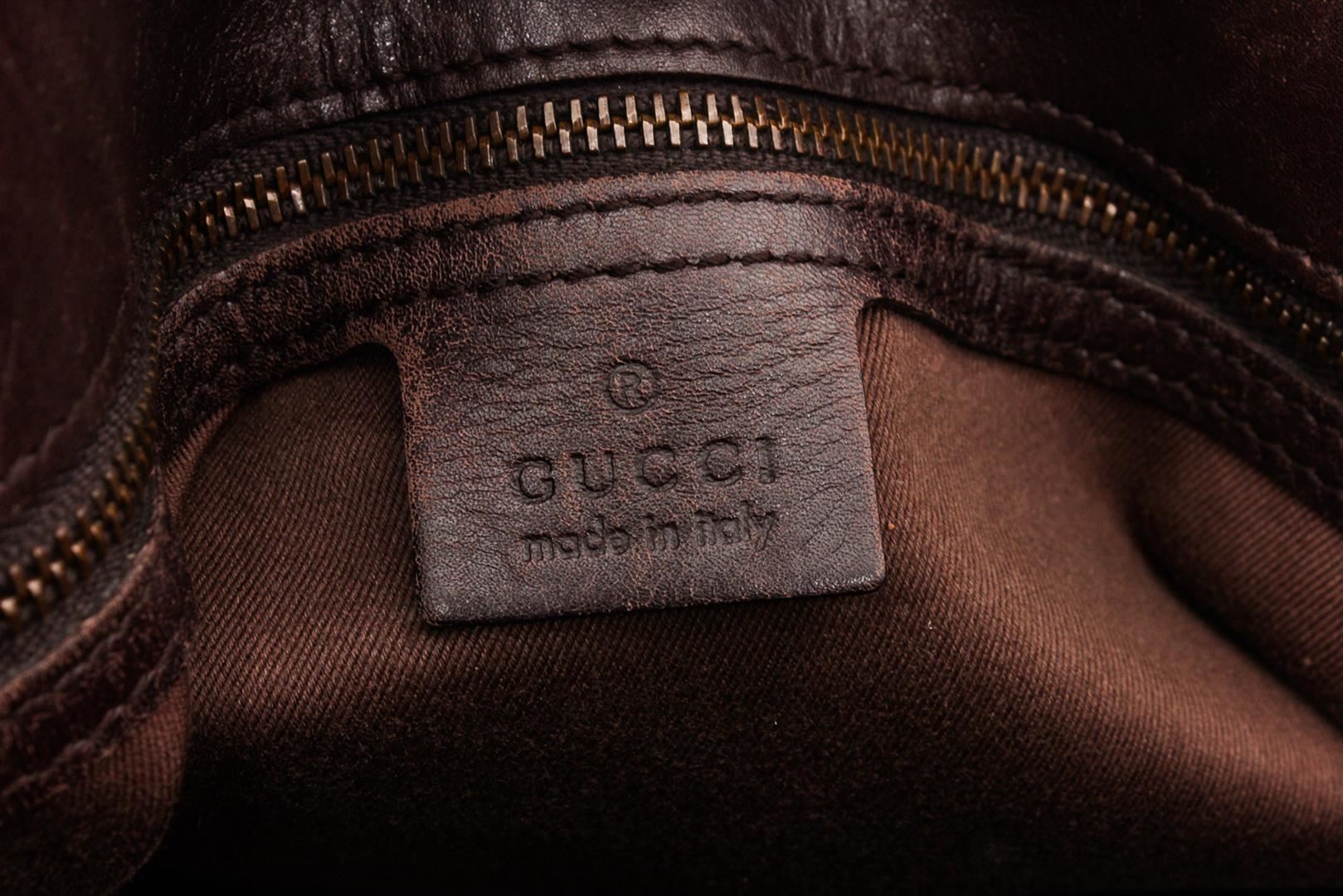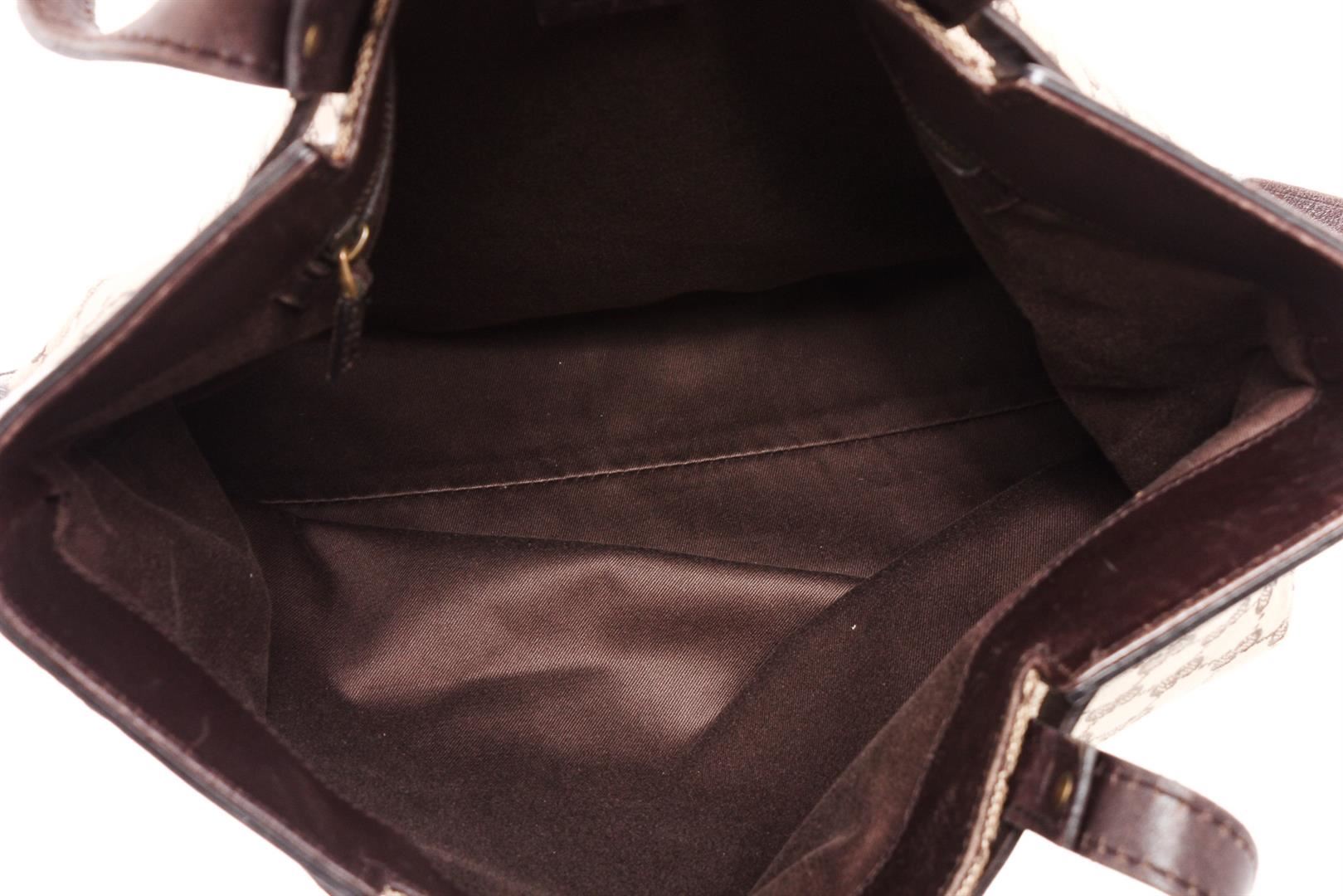 Brown and beige GG canvas Gucci tote bag with gold-tone hardware, dual flat handles, chocolate leather trim, brown canvas lining, and one interior pocket with zip closure.