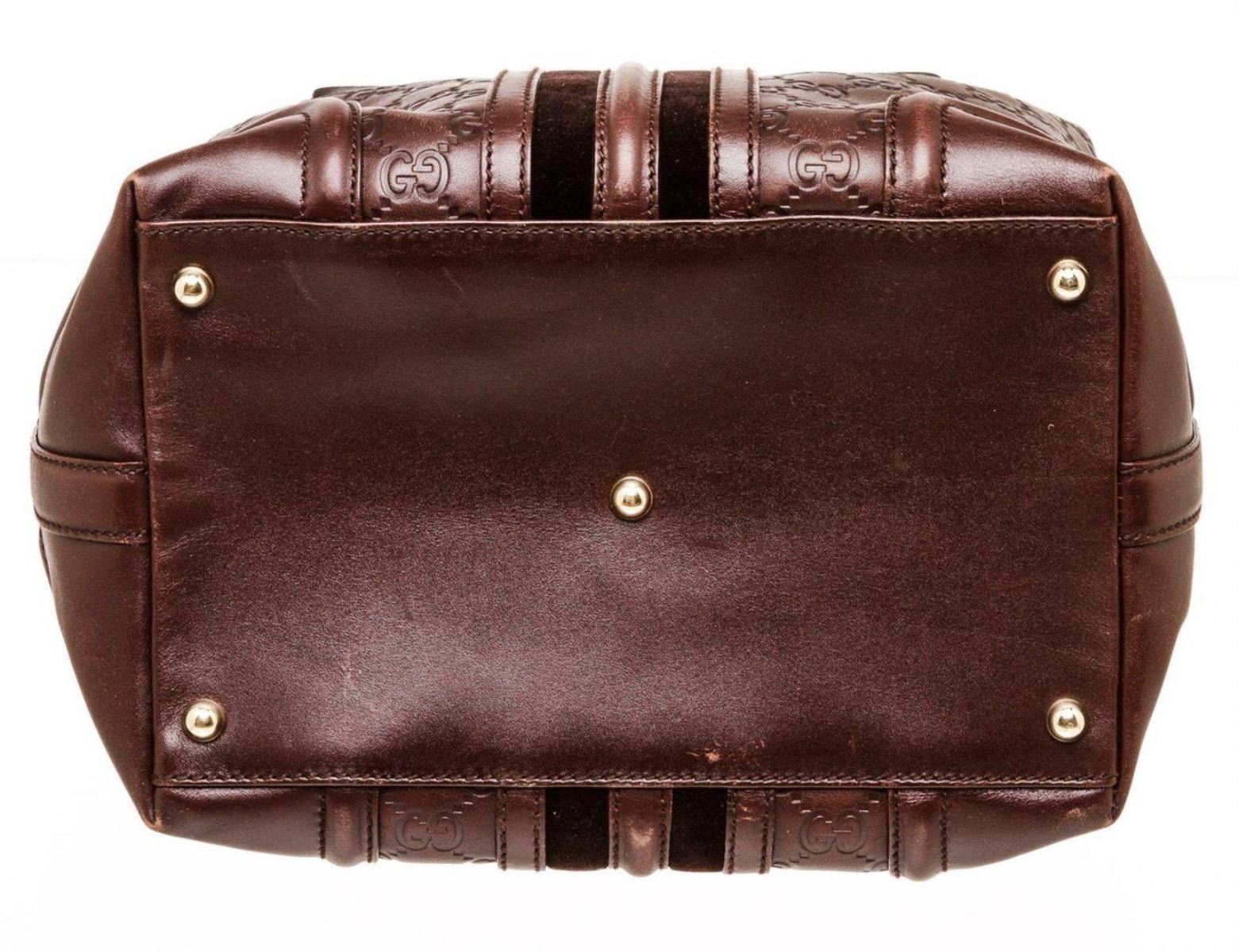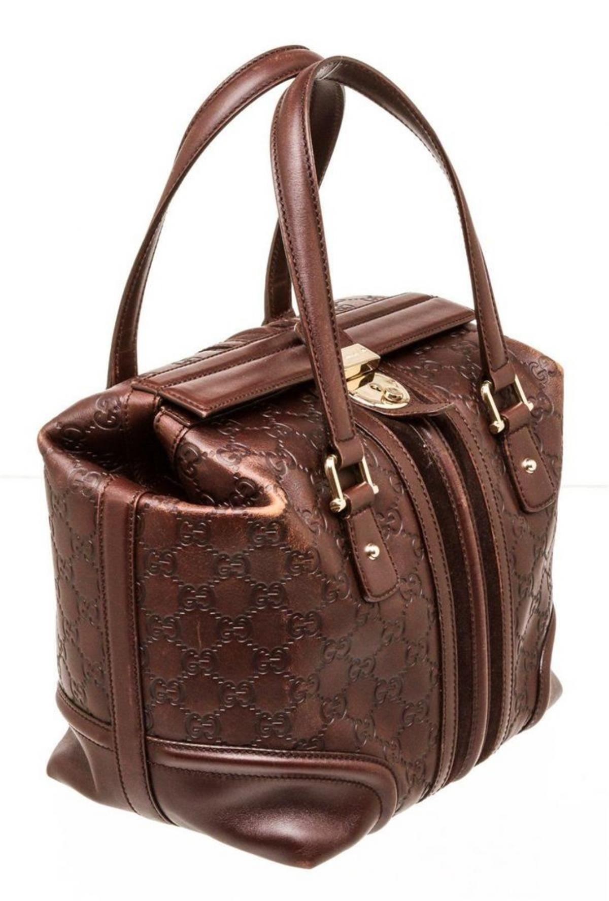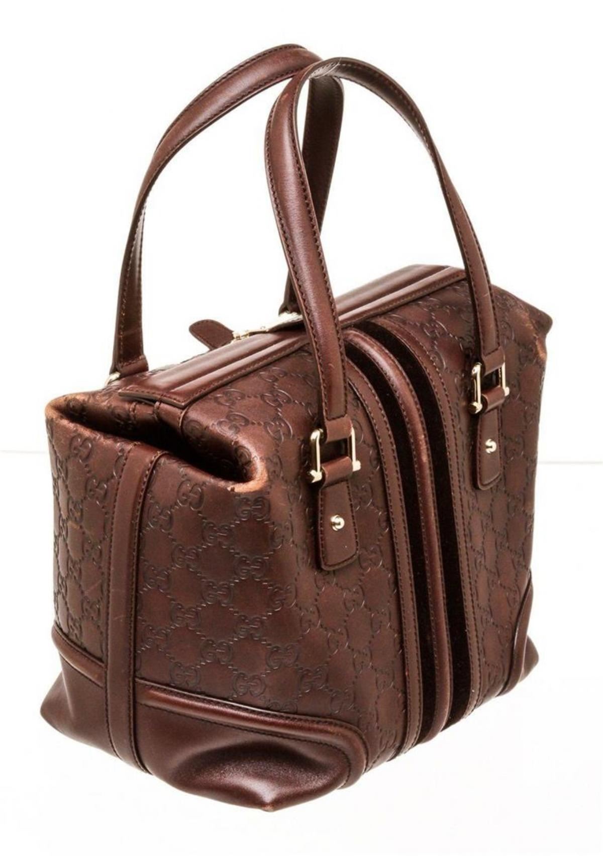 Brown Guccissima leather Gucci bowler satchel bag with gold-tone hardware, tonal fabric lining, one zipper pocket at interior wall, dual flat shoulder straps and overall push-lock closure at top. Measurements: Length: 11.5 in / 29 cm Width: 6 in / 15 cm 8.5 in / 22 cm Condition: Pre-Owned Good overall, please see photographs for detail.