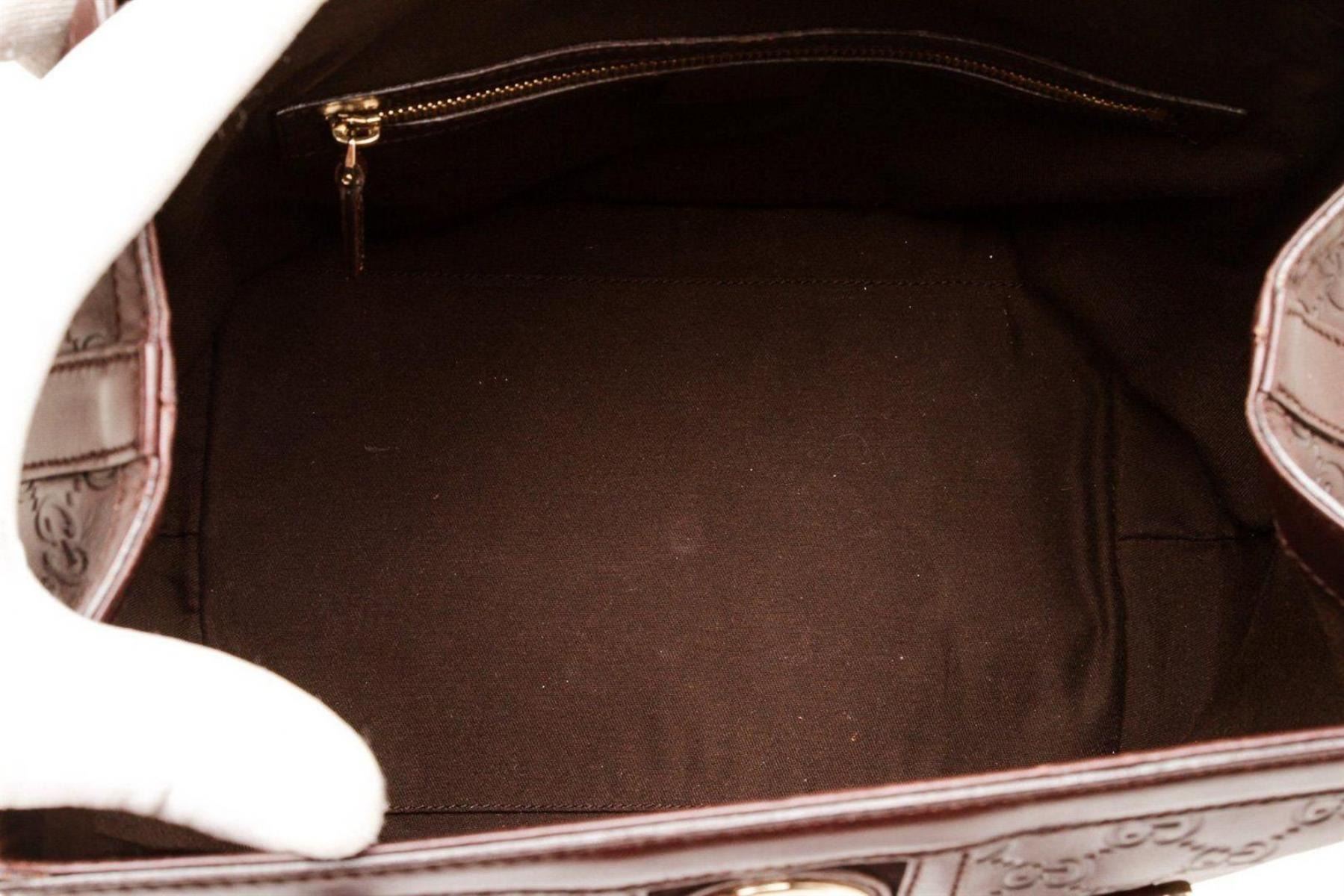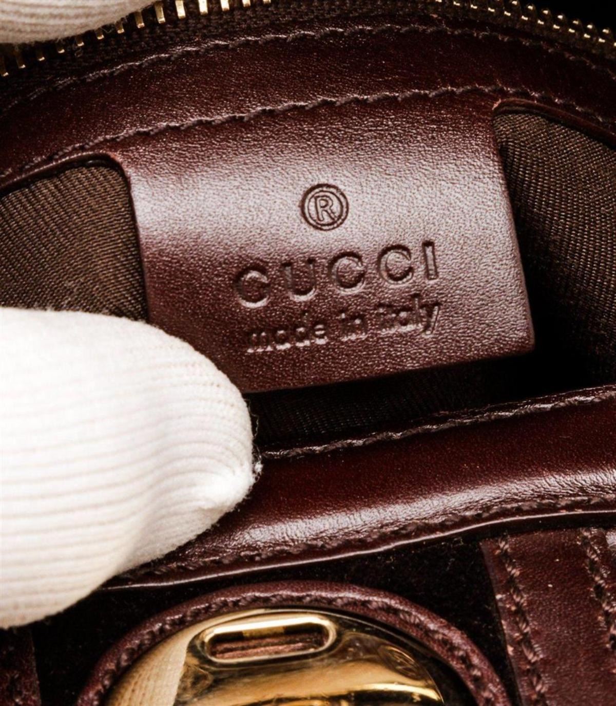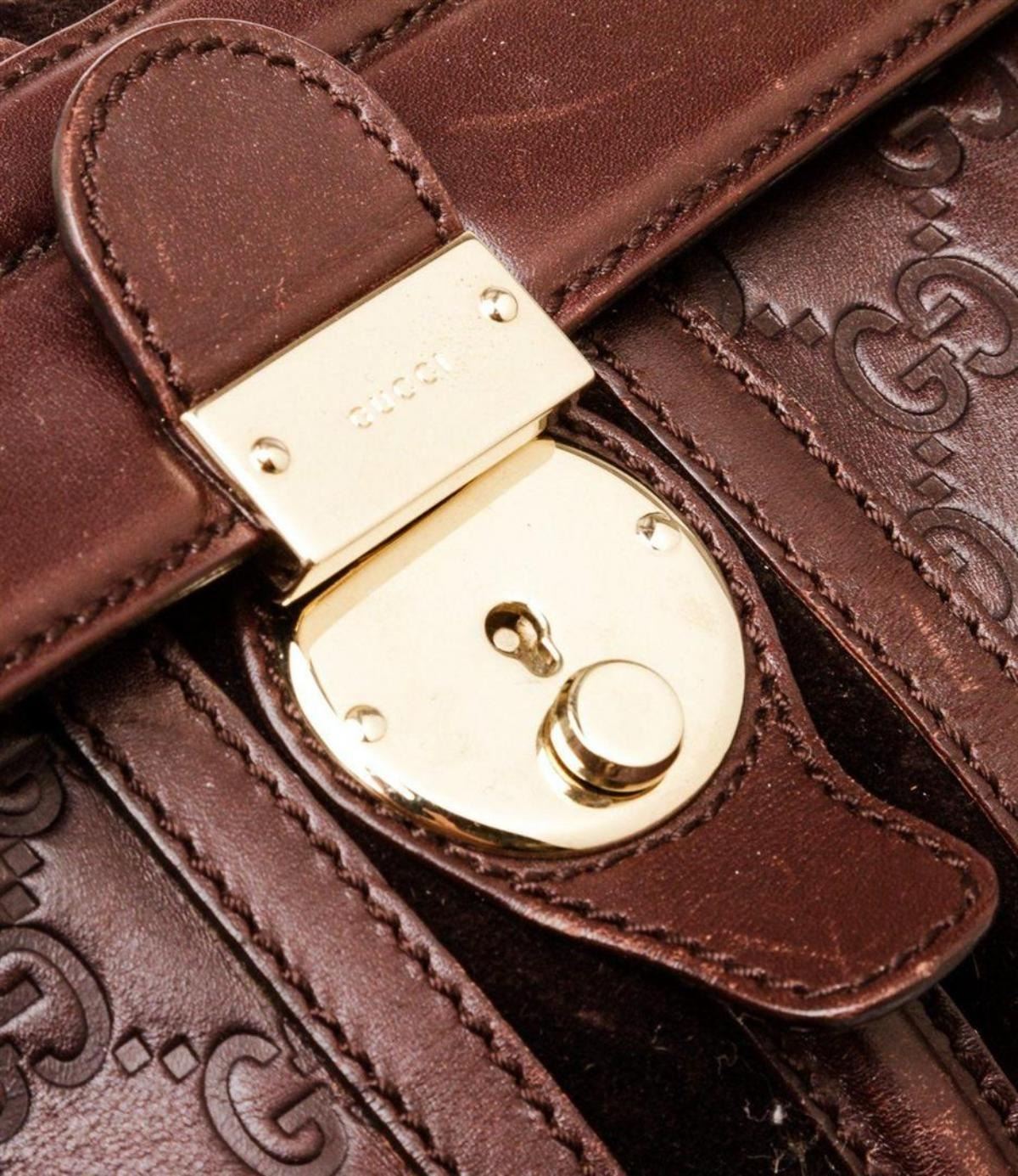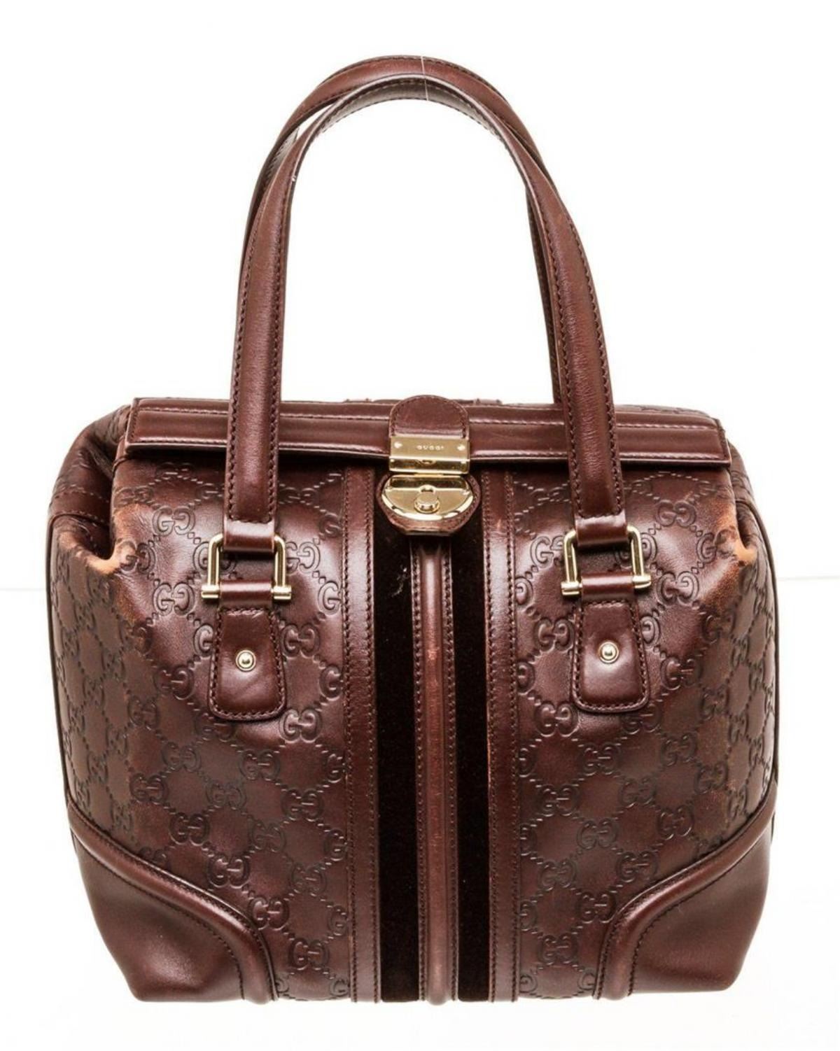 Brown Guccissima leather Gucci bowler satchel bag with gold-tone hardware, tonal fabric lining, one zipper pocket at interior wall, dual flat shoulder straps and overall push-lock closure at top. Measurements: Length: 11.5 in / 29 cm Width: 6 in / 15 cm 8.5 in / 22 cm Condition: Pre-Owned Good overall, please see photographs for detail.