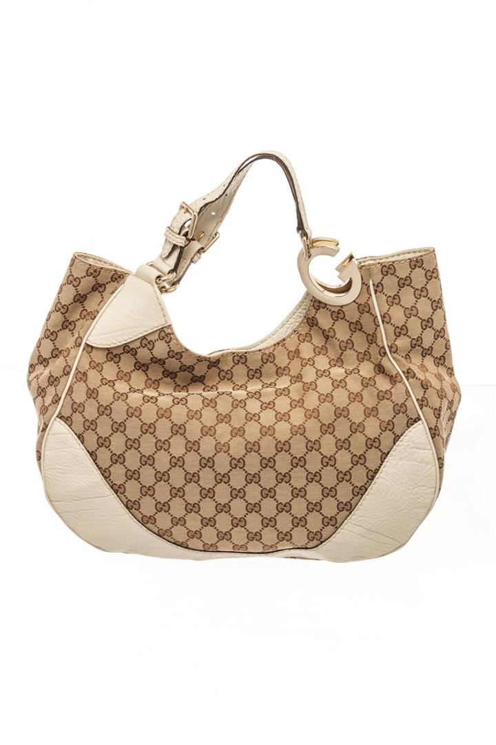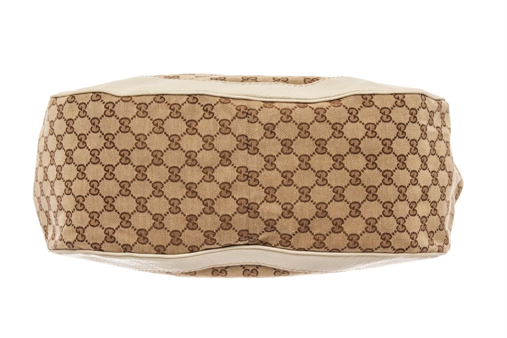 Gucci Brown Leather Charlotte GG Shoulder Bag. All available information is listed in the description and shown in the photos. gucci brown leather charlotte gg shoulder bag with printed, gold-tone hardware, leather trim, dual adjustable shoulder straps, canvas lining & single interior pocket, snap closure at top. Height: 12" Width: 15" Depth: 6", Shoulder Strap Drop: 7" / 30.48 x 38.1 x 15.24 Cm