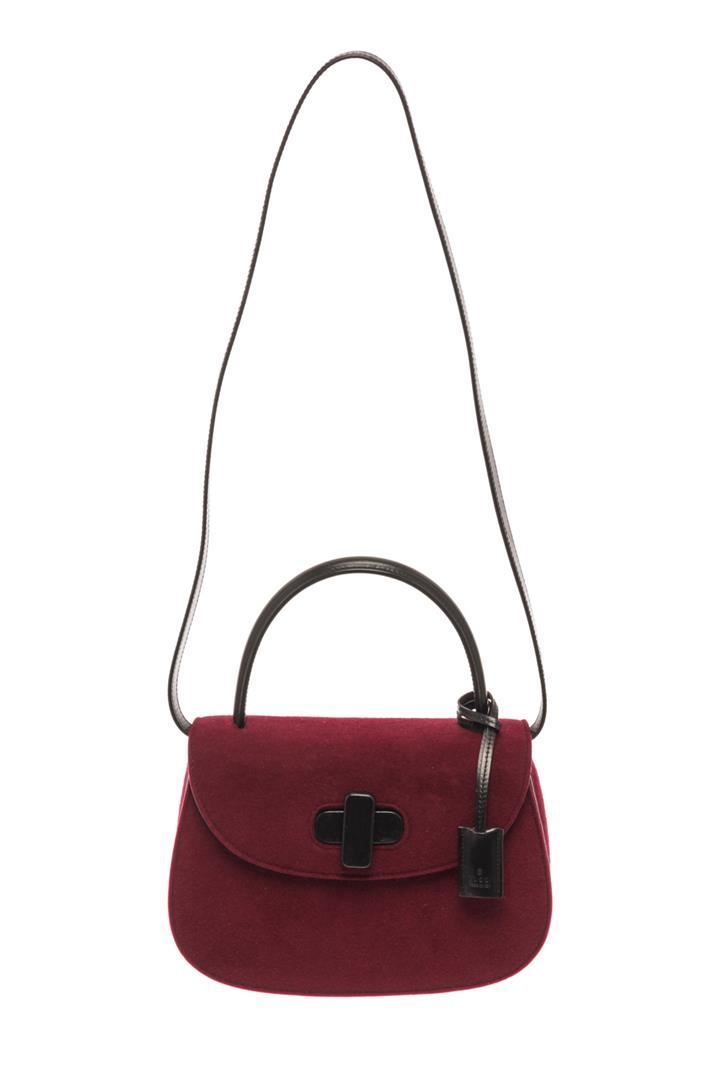 Gucci Burgandy Maroon Velvet Top Handle Bag. All available information is listed in the description and shown in the photos. Gucci Burgandy Maroon Velvet Top Handle Bag with gold-tone hardware, maroon velvet body and a leather handle and turn lock closure. Interior is lined in leather and features a slip pocket with a button closure, a zip pocket and small slip pocket. 18cm (length) x 7cm (depth) x 15cm (height) /7.08" x 2.75" x 5.90" Inches