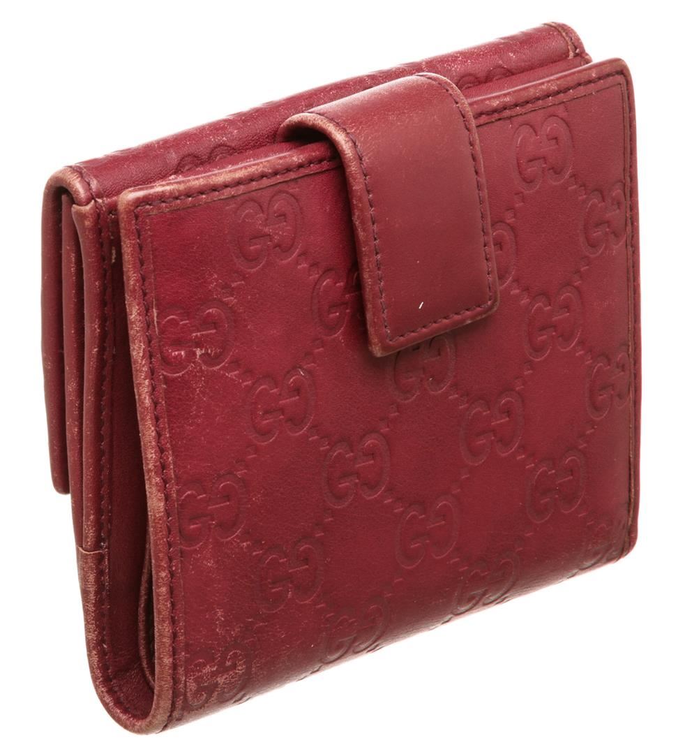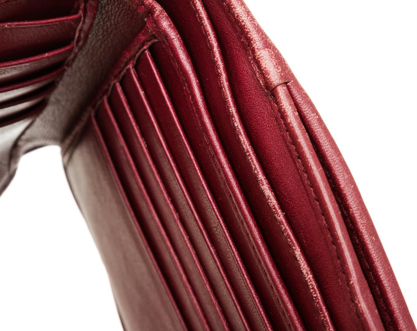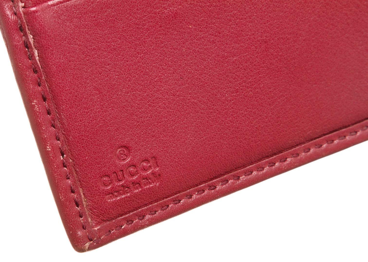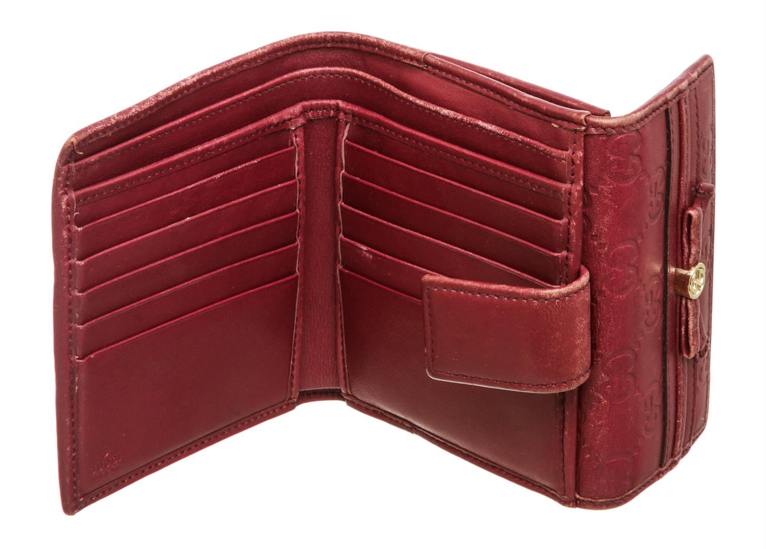 Dark Red Guccissima leather Gucci French purse with gold tone hardware, single exterior coin compartment with snap closure at flap, tonal leather lining, dual slip pockets at interior walls, dual bill compartments, ten card slots and snap closure at top strap.